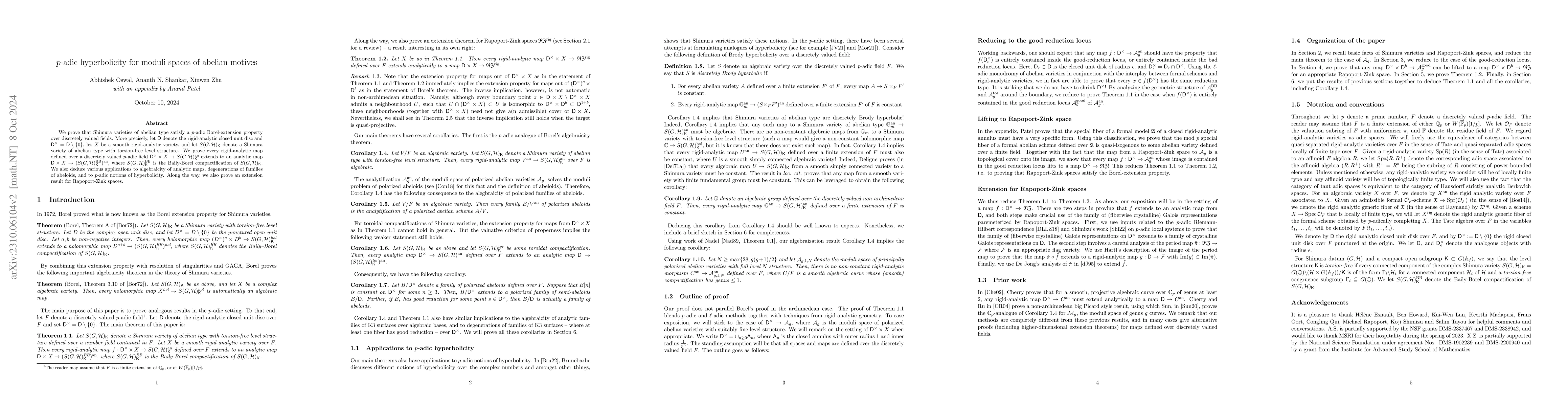 The paper establishes a p-adic analogue of Borel's extension theorem for Shimura varieties of abelian type, extending rigid-analytic techniques to demonstrate extension properties over discretely valued p-adic fields.