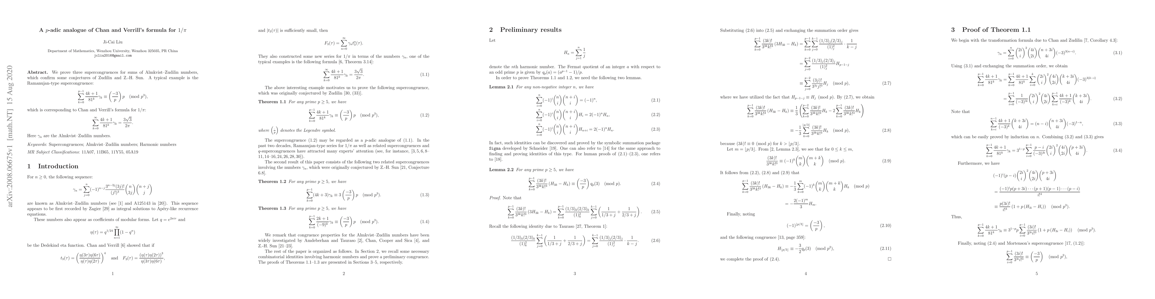 This paper establishes three supercongruences for sums involving Almkvist-Zudilin numbers, confirming conjectures by Zudilin and Sun. A notable result is a $p$-adic analogue of Chan and Verrill's formula for $1/\pi$.