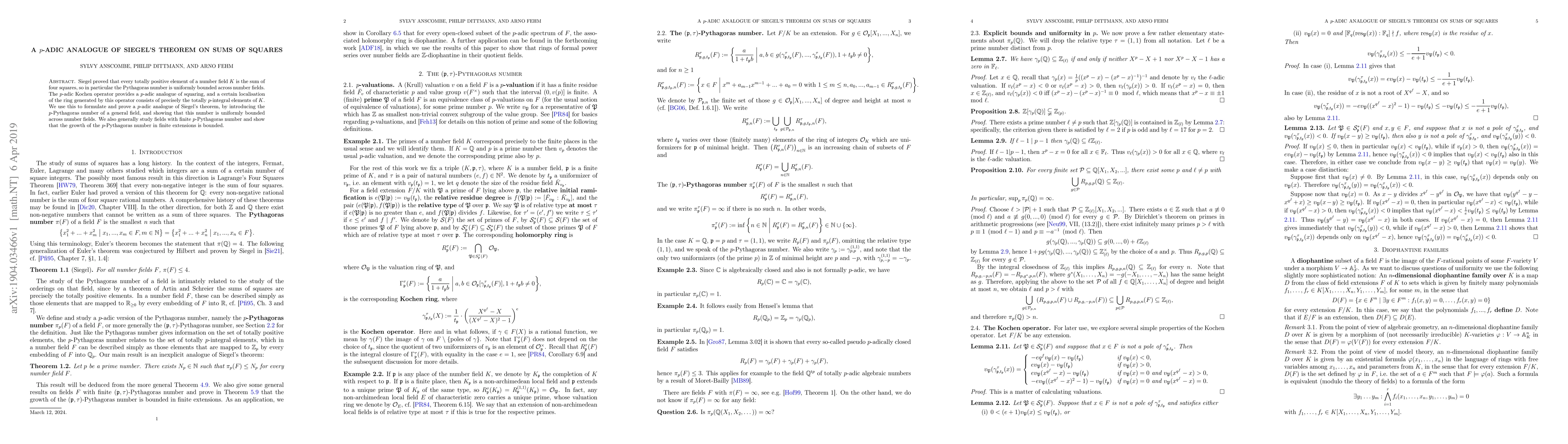 Siegel proved that every totally positive element of a number field K is the sum of four squares, so in particular the Pythagoras number is uniformly bounded across number fields. The p-adic Kochen operator provides a p-adic analogue of squaring, and a certain localisation of the ring generated by this operator consists of precisely the totally p-integral elements of K. We use this to formulate and prove a p-adic analogue of Siegel's theorem, by introducing the p-Pythagoras number of a general field, and showing that this number is uniformly bounded across number fields. We also generally study fields with finite p-Pythagoras number and show that the growth of the p-Pythagoras number in finite extensions is bounded.