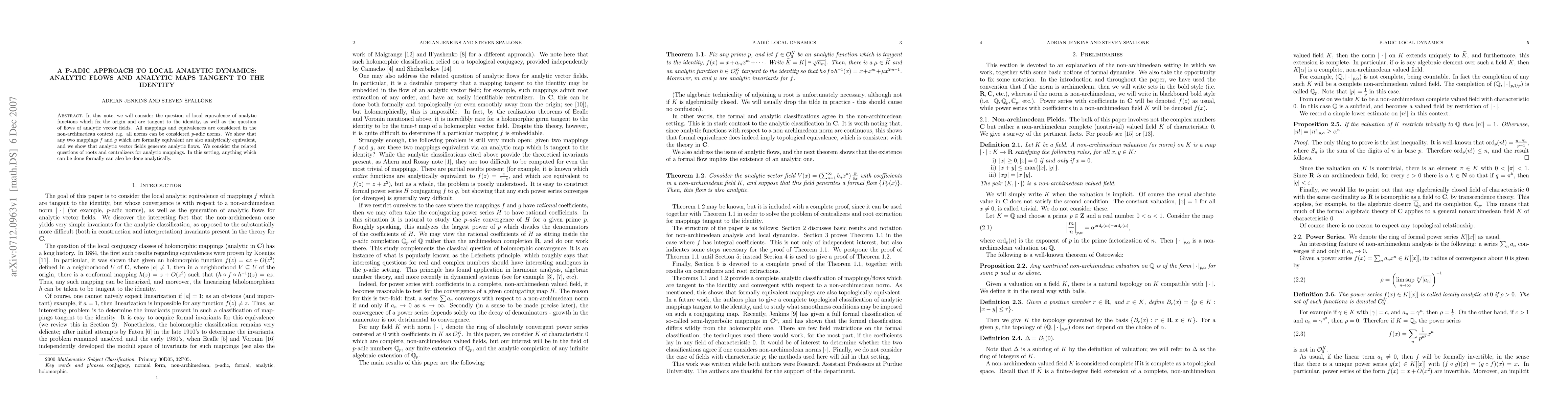 In this note, we will consider the question of local equivalence of analytic functions which fix the origin and are tangent to the identity, as well as the question of flows of analytic vector fields. All mappings and equivalences are considered in the non-archimedean context e.g. all norms can be considered $p$-adic norms. We show that any two mappings $f$ and $g$ which are formally equivalent are also analytically equivalent, and we show that analytic vector fields generate analytic flows. We consider the related questions of roots and centralizers for analytic mappings. In this setting, anything which can be done formally can also be done analytically.