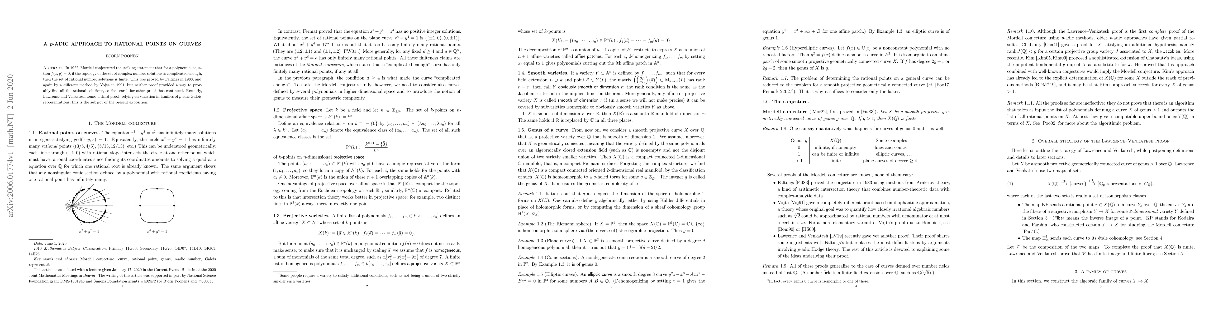 In 1922, Mordell conjectured the striking statement that for a polynomial equation $f(x,y)=0$, if the topology of the set of complex number solutions is complicated enough, then the set of rational number solutions is finite. This was proved by Faltings in 1983, and again by a different method by Vojta in 1991, but neither proof provided a way to provably find all the rational solutions, so the search for other proofs has continued. Recently, Lawrence and Venkatesh found a third proof, relying on variation in families of $p$-adic Galois representations; this is the subject of the present exposition.