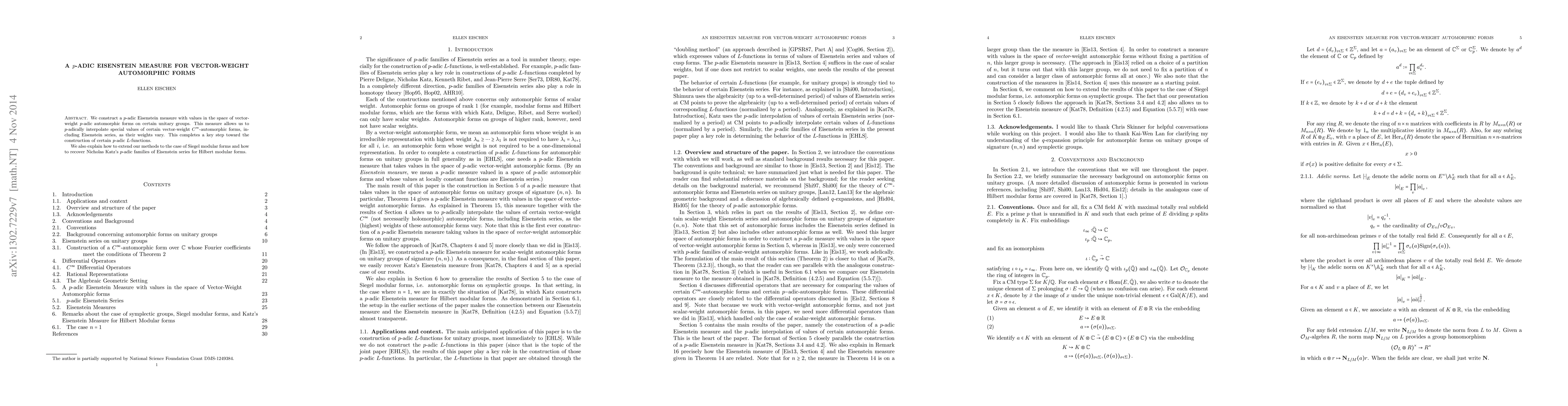 Summary: The paper constructs a p-adic Eisenstein measure for vector-weight automorphic forms on unitary groups, enabling p-adic interpolation of special values, including Eisenstein series, and extends these methods to Siegel modular forms, recovering Katz's p-adic families for Hilbert modular forms.