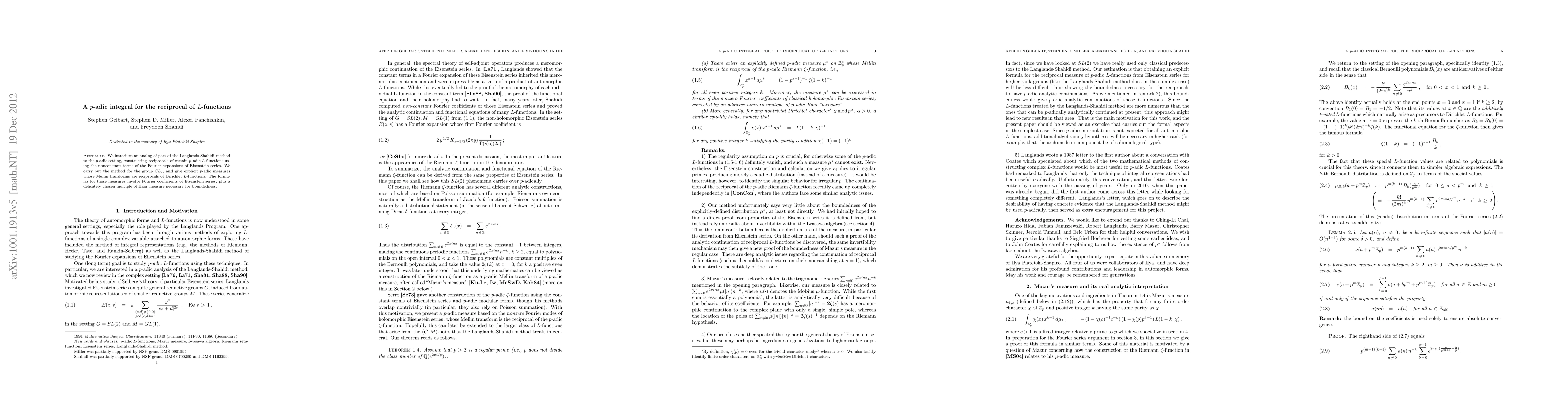 This paper introduces a p-adic analog of the Langlands-Shahidi method to construct reciprocals of p-adic L-functions using Fourier expansions of Eisenstein series, specifically for the group SL(2), and provides explicit p-adic measures linked to Dirichlet L-functions.