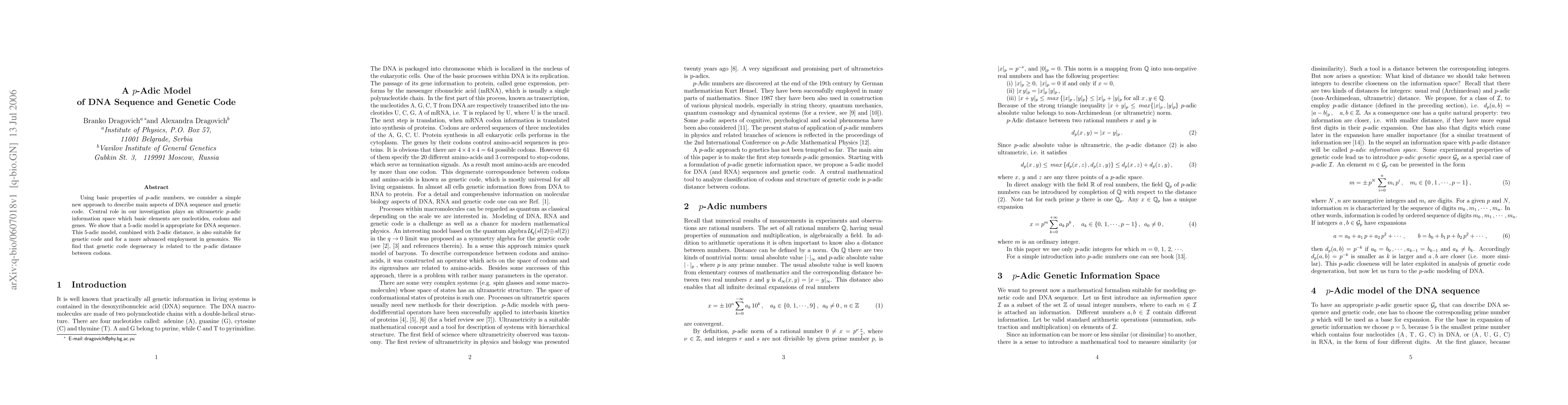 Using basic properties of p-adic numbers, we consider a simple new approach to describe main aspects of DNA sequence and genetic code. Central role in our investigation plays an ultrametric p-adic information space which basic elements are nucleotides, codons and genes. We show that a 5-adic model is appropriate for DNA sequence. This 5-adic model, combined with 2-adic distance, is also suitable for genetic code and for a more advanced employment in genomics. We find that genetic code degeneracy is related to the p-adic distance between codons.