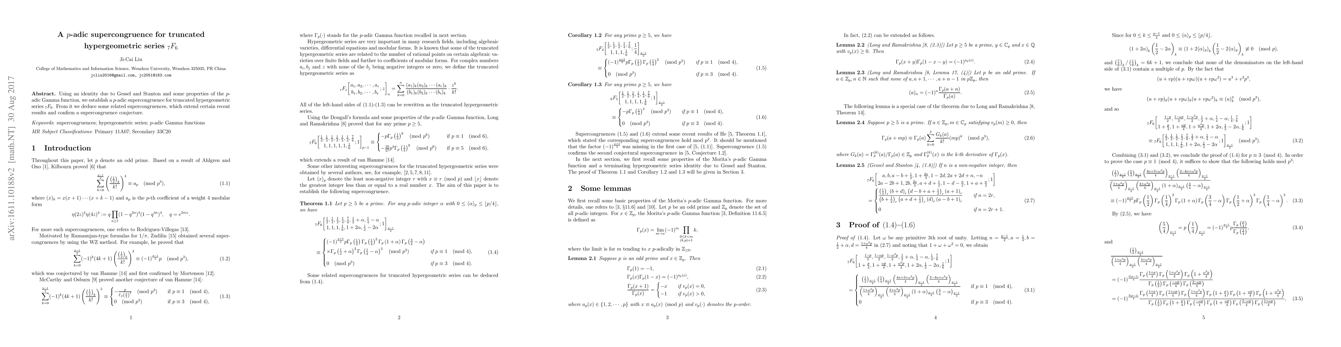 Using an identity due to Gessel and Stanton and some properties of the $p$-adic Gamma function, we establish a $p$-adic supercongruence for truncated hypergeometric series ${}_7F_6$. From it we deduce some related supercongruences, which extend certain recent results and confirm a supercongruence conjecture.