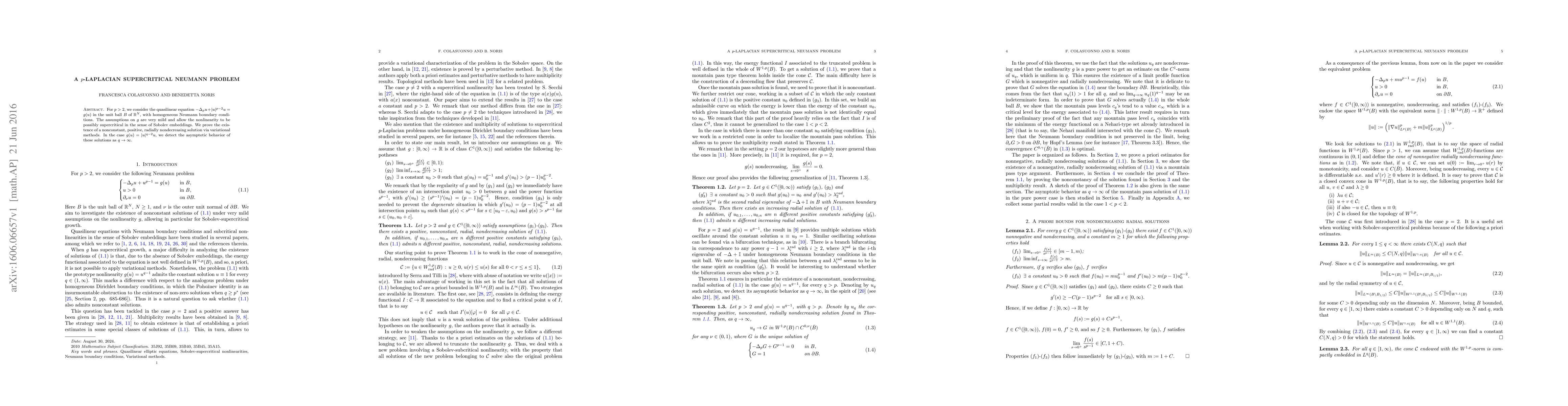 For $p>2$, we consider the quasilinear equation $-\Delta_p u+|u|^{p-2}u=g(u)$ in the unit ball $B$ of $\mathbb R^N$, with homogeneous Neumann boundary conditions. The assumptions on $g$ are very mild and allow the nonlinearity to be possibly supercritical in the sense of Sobolev embeddings. We prove the existence of a nonconstant, positive, radially nondecreasing solution via variational methods. In the case $g(u)=|u|^{q-2}u$, we detect the asymptotic behavior of these solutions as $q\to\infty$.