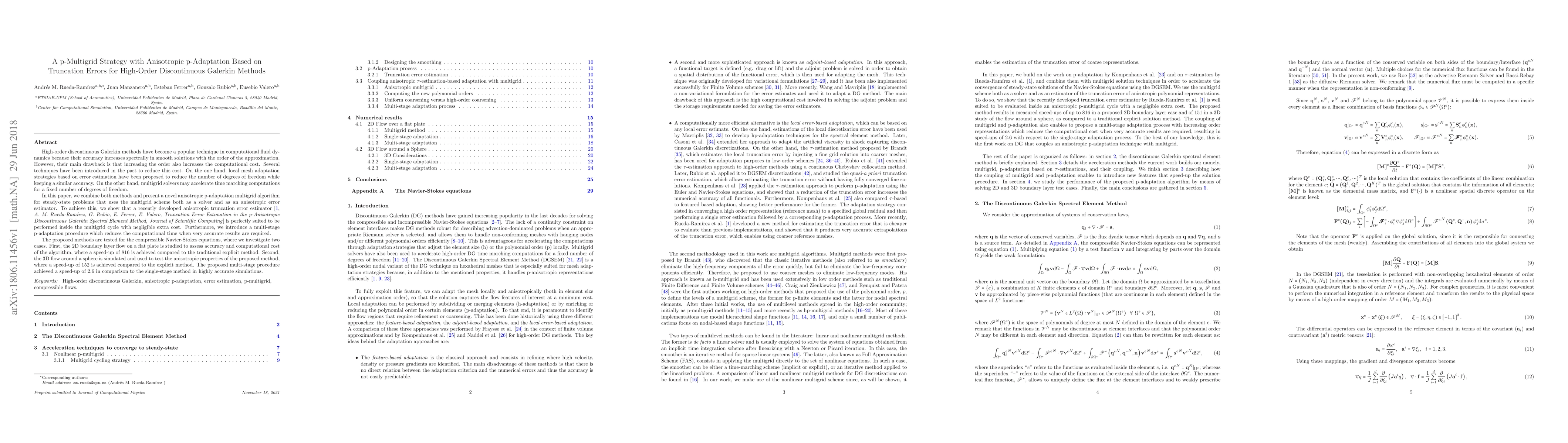 This paper presents a novel anisotropic p-adaptation multigrid strategy for high-order Discontinuous Galerkin methods, combining local mesh adaptation and multigrid solvers to reduce computational costs while maintaining accuracy. The method achieves significant speed-ups in simulations of the compressible Navier-Stokes equations, demonstrating efficiency and effectiveness in both 2D and 3D flow scenarios.