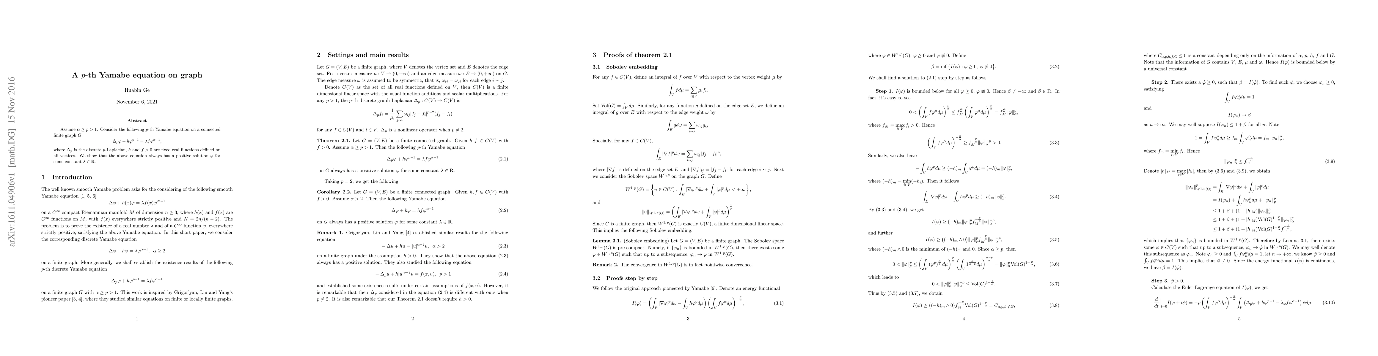 The paper establishes existence of positive solutions for the p-th Yamabe equation on finite graphs using Sobolev spaces and energy functionals, extending previous work on similar equations.