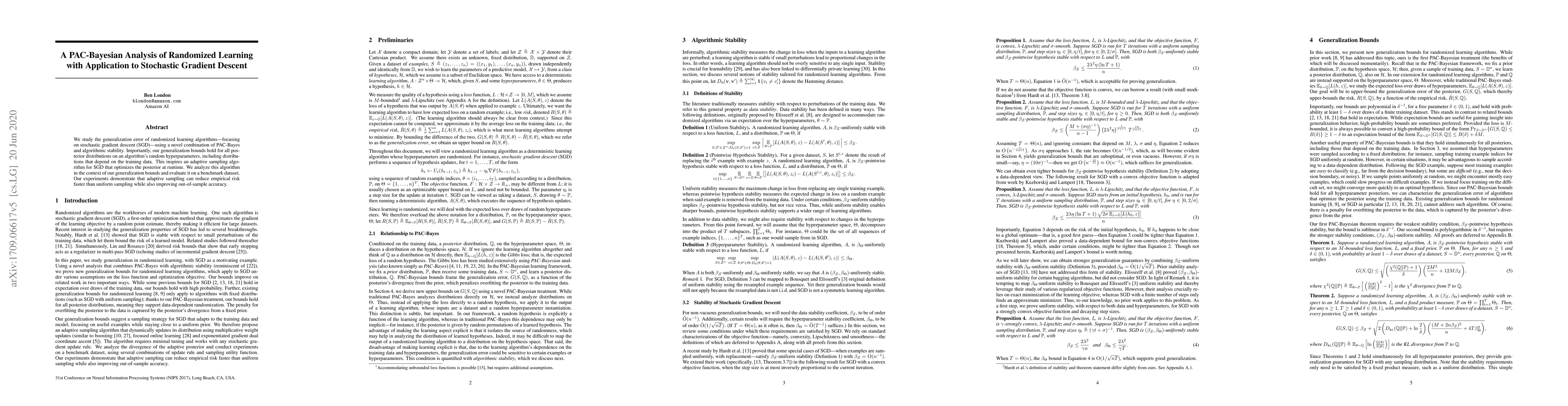 This paper combines PAC-Bayesian theory and algorithmic stability to analyze the generalization error of randomized learning algorithms, particularly stochastic gradient descent (SGD). It introduces an adaptive sampling algorithm for SGD that optimizes posterior distributions at runtime, showing improved empirical risk reduction and out-of-sample accuracy over uniform sampling.