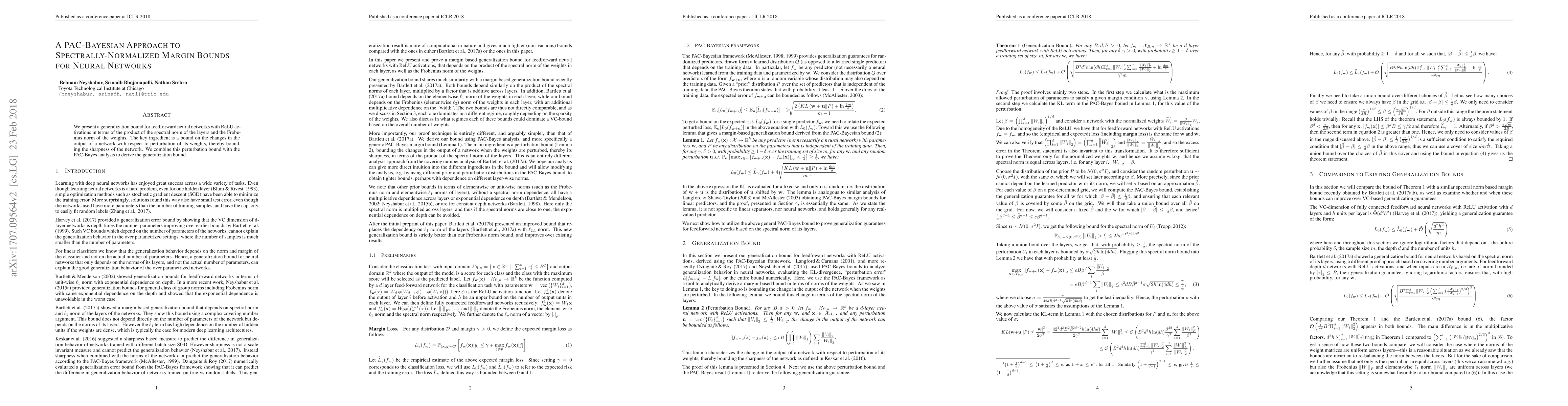 We present a generalization bound for feedforward neural networks in terms of the product of the spectral norm of the layers and the Frobenius norm of the weights. The generalization bound is derived using a PAC-Bayes analysis.
