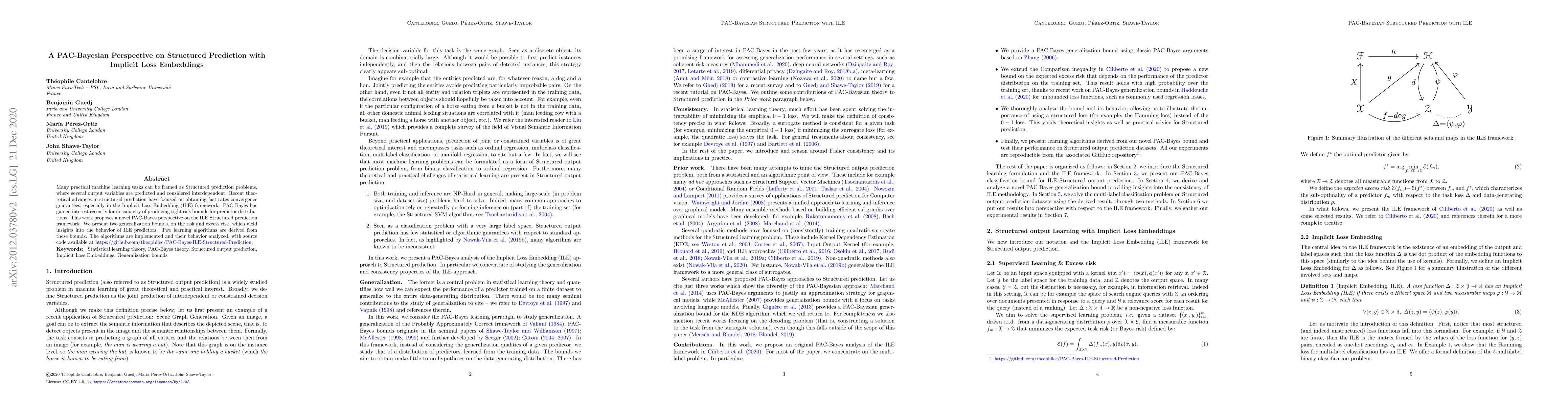This paper introduces a PAC-Bayesian approach to the Implicit Loss Embedding (ILE) framework for structured prediction, offering tight risk and excess risk bounds. Two learning algorithms are developed based on these bounds, and their performance is analyzed with accompanying source code available for review.