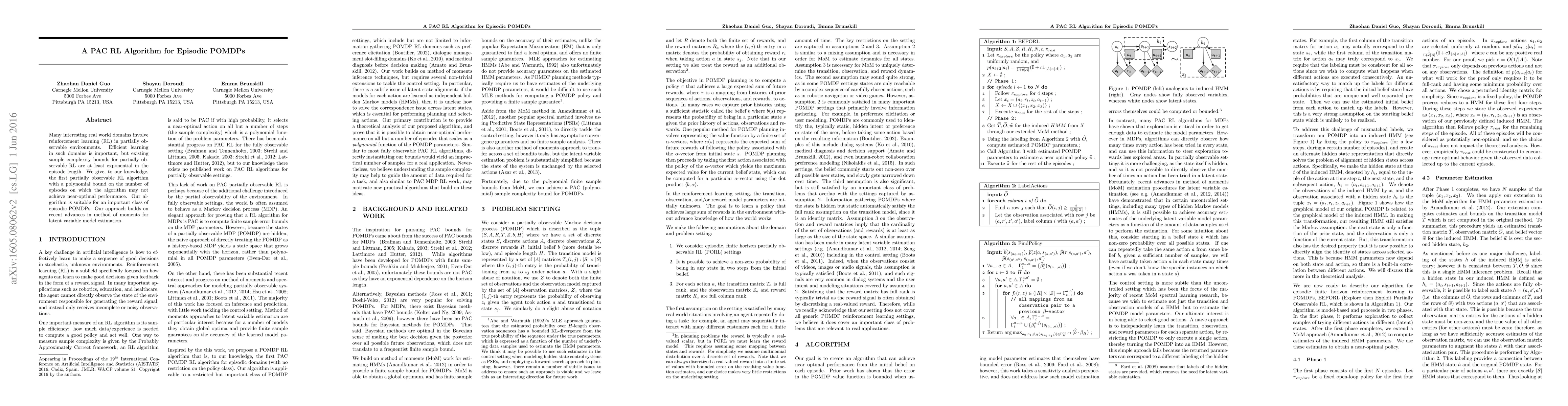 This paper introduces a novel reinforcement learning algorithm for episodic partially observable Markov decision processes (POMDPs) that achieves polynomial sample complexity, providing a significant improvement over existing exponential bounds. The method leverages advances in the method of moments for latent variable model estimation.