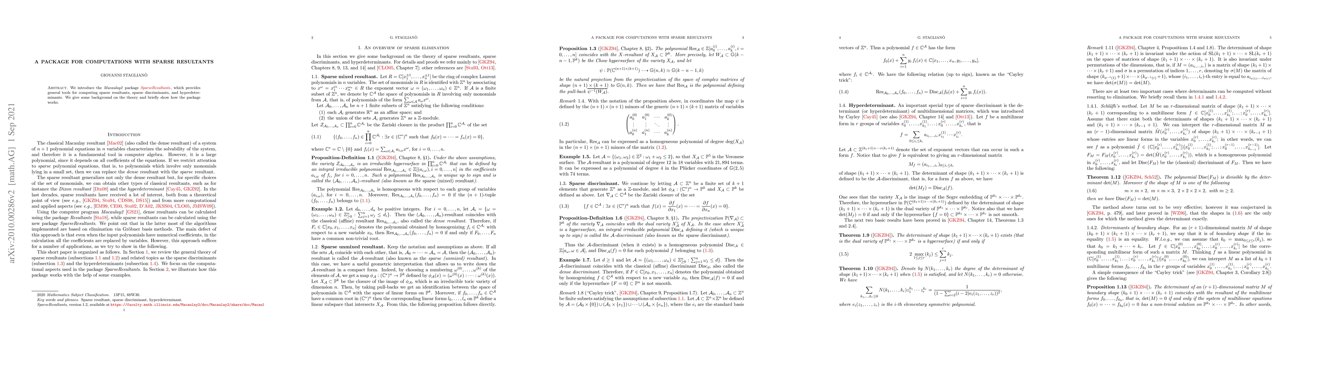 The Macaulay2 package SparseResultants offers a comprehensive set of functions for computing sparse resultants, discriminants, and hyperdeterminants, combining elimination techniques with specialized algorithms.