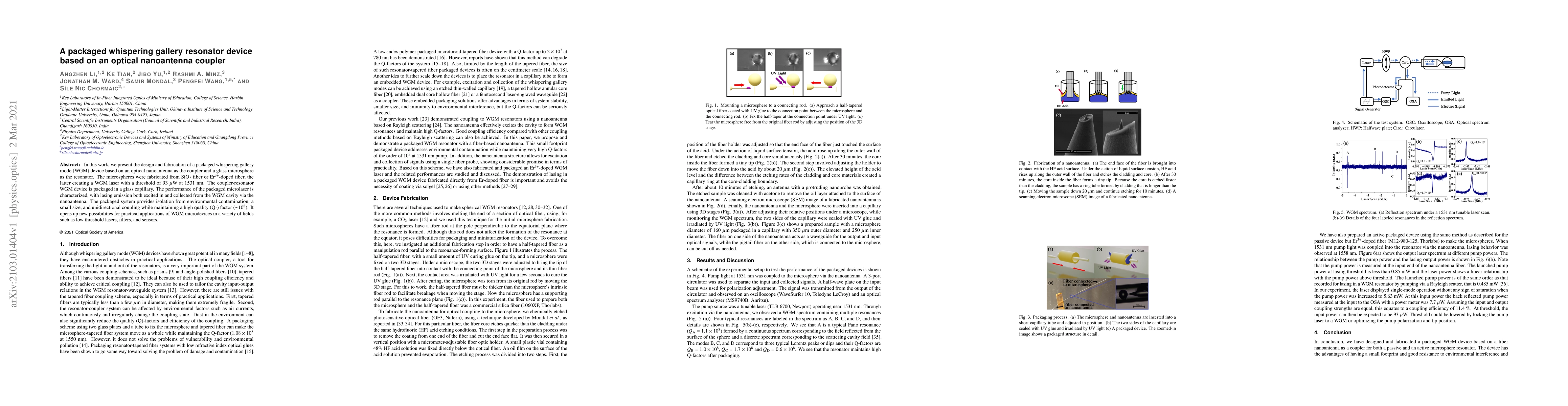 This paper details the design and packaging of a whispering gallery mode (WGM) device using an optical nanoantenna coupler and a glass microsphere resonator, achieving a low-threshold Er$^{3+}$-doped microlaser. The packaged system offers small size, high isolation, and a high Q-factor, promising applications in low-threshold lasers, filters, and sensors.