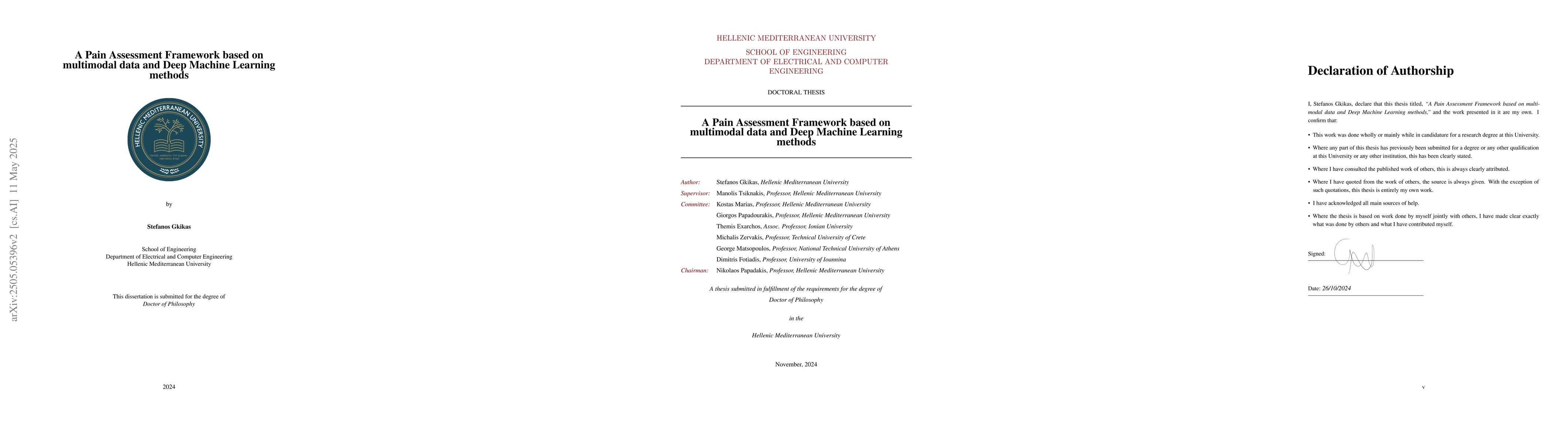 This research aims to develop advanced computational methods for automatic pain assessment using deep machine learning and multimodal data. The proposed frameworks achieve high performance and are designed to be applicable in real-world clinical settings, demonstrating state-of-the-art results and paving the way for future AI advancements.