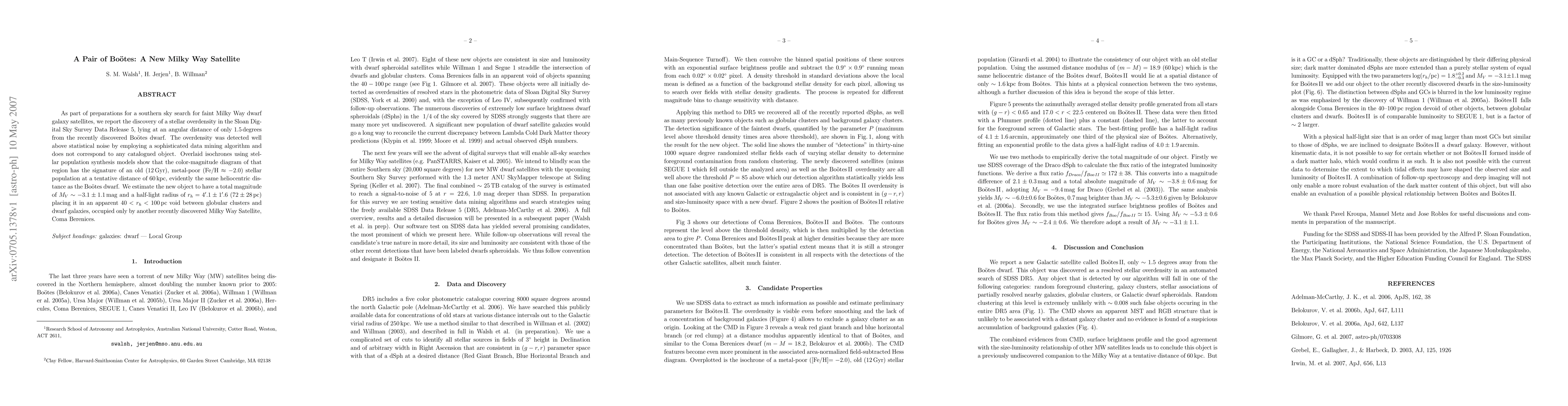 A new Milky Way satellite, Bo s{e}tes 2, has been discovered in the Sloan Digital Sky Survey Data Release 5, located at a distance of 60 kpc from the recently found Bo s{e}tes dwarf galaxy, with estimated characteristics similar to its companion.