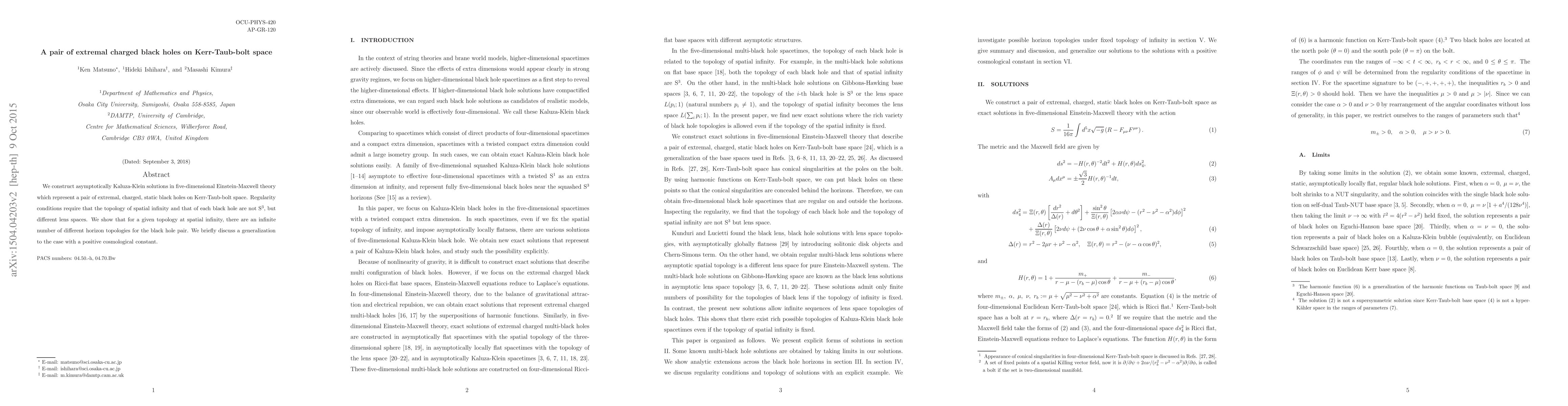 We construct asymptotically Kaluza-Klein solutions in five-dimensional Einstein-Maxwell theory which represent a pair of extremal, charged, static black holes on Kerr-Taub-bolt space. Regularity conditions require that the topology of spatial infinity and that of each black hole are not S$^3$, but different lens spaces. We show that for a given topology at spatial infinity, there are an infinite number of different horizon topologies for the black hole pair. We briefly discuss a generalization to the case with a positive cosmological constant.
