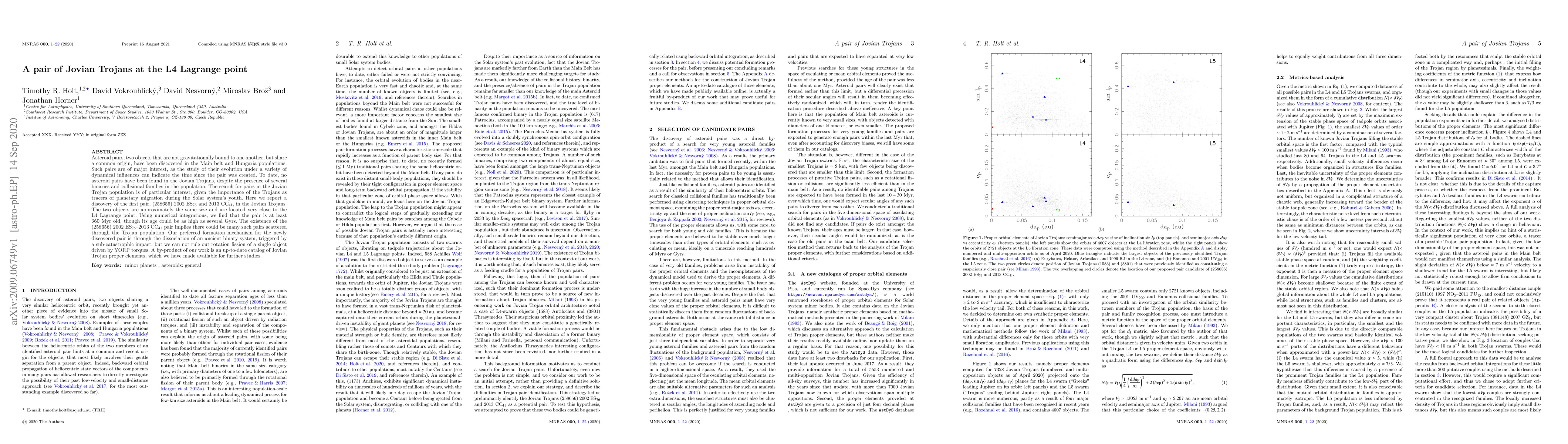 This paper reports the discovery of the first pair of Jovian Trojans, (258656) 2002~ES$_{76}$ and 2013~CC$_{41}$, located near the L4 Lagrange point, suggesting the presence of ancient asteroid pairs in the Trojan population and indicating possible planetary migration in the early Solar System.