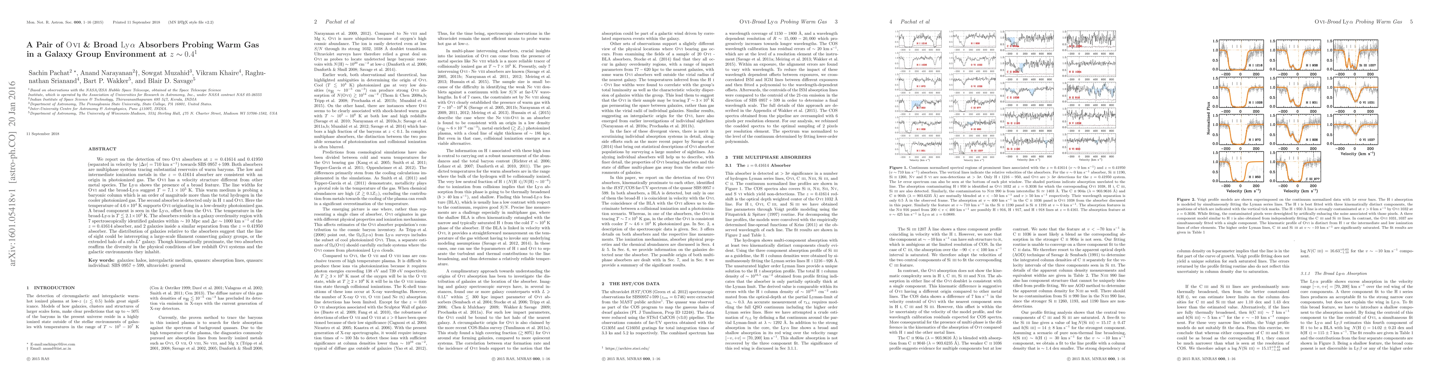 The research identifies two O VI absorbers at z ~ 0.4, revealing multiphase warm baryon reservoirs. One absorber shows photoionized gas with T = 7.1 x 10^5 K and broad Ly-alpha, while the other indicates T = 4.6 x 10^4 K for photoionized O VI. Both absorbers are in a galaxy overdensity region, suggesting large-scale filaments or sub-L* galaxy halos. The findings highlight the diversity of low-redshift O VI systems and their galactic environments.