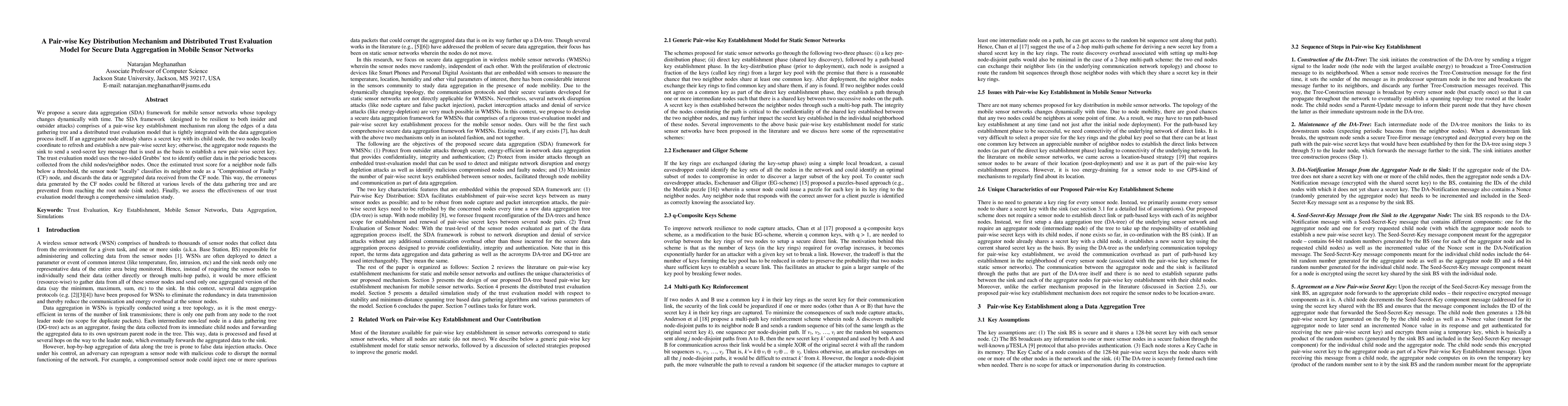 This paper proposes a secure data aggregation framework for mobile sensor networks featuring a pair-wise key distribution mechanism and a distributed trust evaluation model to filter out compromised or faulty nodes, ensuring data integrity and security despite dynamic network topology. The trust model uses the Grubbs test to identify outliers, classifying and discarding data from compromised nodes.