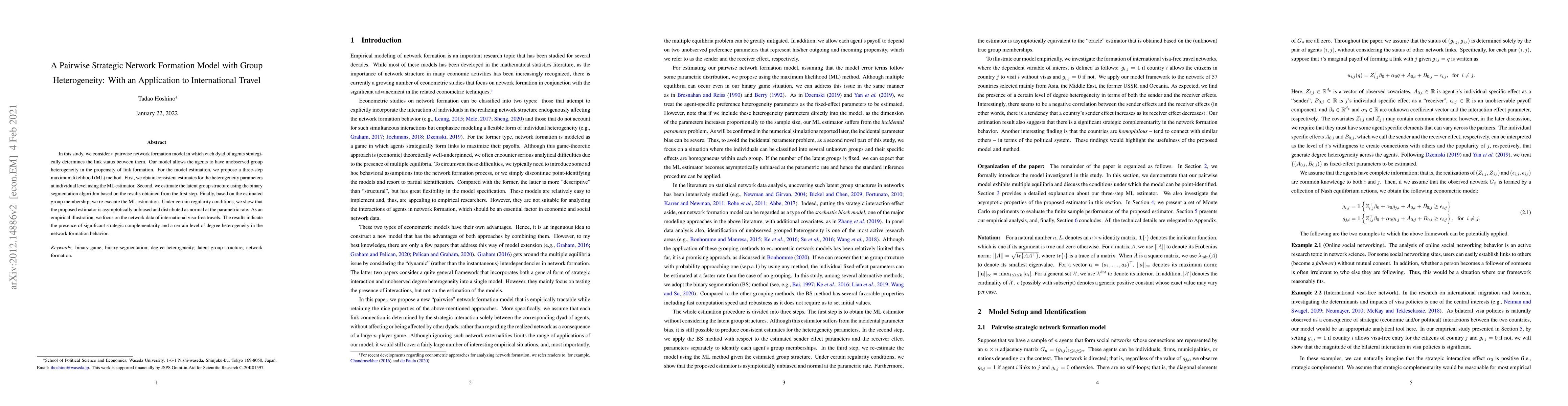 This paper proposes a pairwise strategic network formation model with group heterogeneity, estimating it using a three-step maximum likelihood method. The model reveals strategic complementarity and degree heterogeneity in the international visa-free travel network.