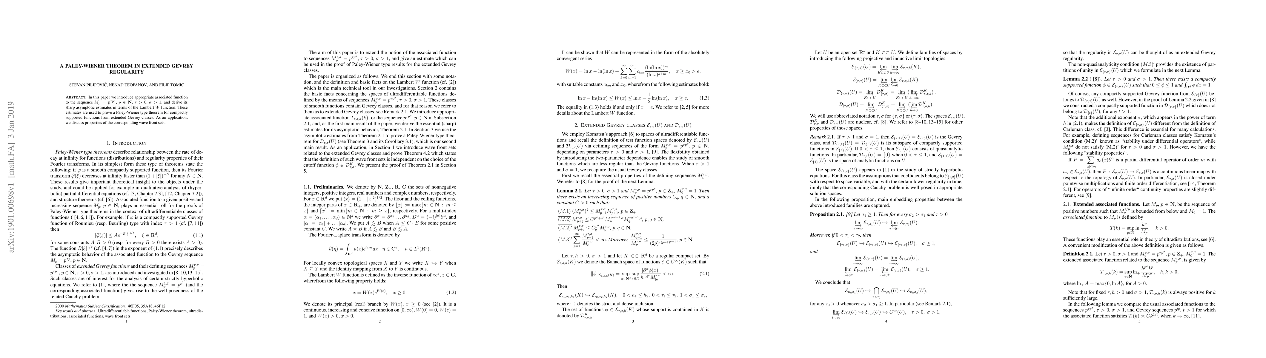 This paper establishes sharp asymptotic estimates for the sequence $M_p$ using the Lambert $W$ function, which are then utilized to prove a Paley-Wiener theorem for functions in extended Gevrey regularity, with an analysis of the resulting wave front sets.