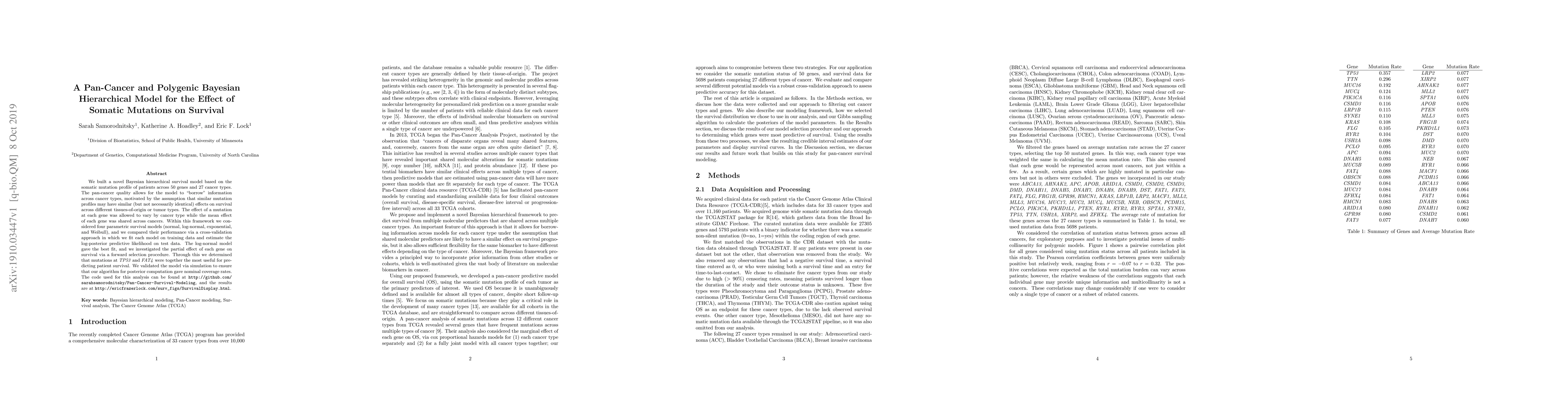 This paper introduces a Bayesian hierarchical survival model to assess the impact of somatic mutations across 27 cancer types, finding that mutations in TP53 and FAT4 significantly affect patient survival. The log-normal model provided the best predictive performance, validated through cross-validation and simulation.