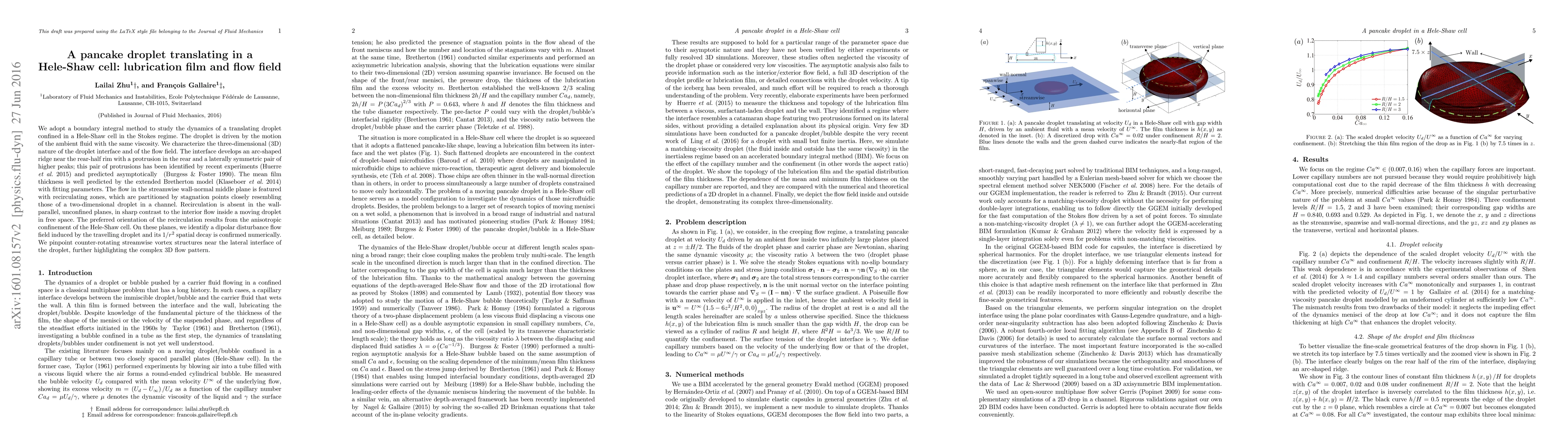 This paper uses a boundary integral method to analyze the dynamics of a translating droplet in a Hele-Shaw cell, revealing a complex three-dimensional flow field with arc-shaped ridges and recirculating zones near the droplet's rear. The study confirms the extended Bretherton model's predictions for film thickness and identifies a dipolar disturbance flow field with counter-rotating vortices.