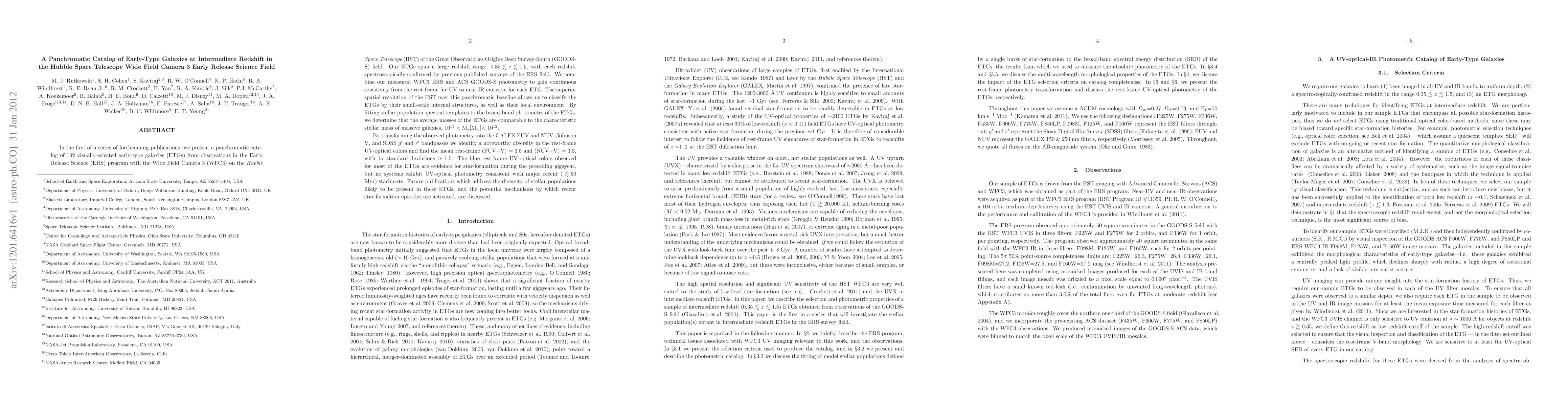 A catalog of 102 early-type galaxies with masses similar to those of massive galaxies is presented from Hubble Space Telescope observations, showing diversity in rest-frame UV-optical colors indicative of past star-formation episodes.