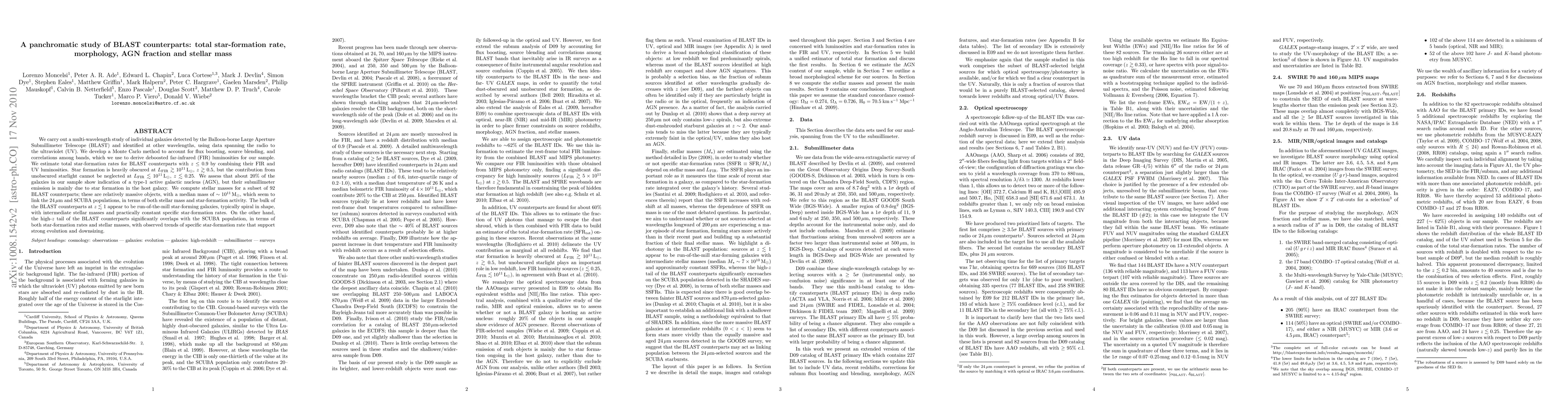 We carry out a multi-wavelength study of individual galaxies detected by the Balloon-borne Large Aperture Submillimeter Telescope (BLAST) and identified at other wavelengths, using data spanning the radio to the ultraviolet (UV). We develop a Monte Carlo method to account for flux boosting, source blending, and correlations among bands, which we use to derive deboosted far-infrared (FIR) luminosities for our sample. We estimate total star-formation rates for BLAST counterparts with z < 0.9 by combining their FIR and UV luminosities. Star formation is heavily obscured at L_FIR > 10^11 L_sun, z > 0.5, but the contribution from unobscured starlight cannot be neglected at L_FIR < 10^11 L_sun, z < 0.25. We assess that about 20% of the galaxies in our sample show indication of a type-1 active galactic nucleus (AGN), but their submillimeter emission is mainly due to star formation in the host galaxy. We compute stellar masses for a subset of 92 BLAST counterparts; these are relatively massive objects, with a median mass of ~10^11 M_sun, which seem to link the 24um and SCUBA populations, in terms of both stellar mass and star-formation activity. The bulk of the BLAST counterparts at z<1 appear to be run-of-the-mill star-forming galaxies, typically spiral in shape, with intermediate stellar masses and practically constant specific star-formation rates. On the other hand, the high-z tail of the BLAST counterparts significantly overlaps with the SCUBA population, in terms of both star-formation rates and stellar masses, with observed trends of specific star-formation rate that support strong evolution and downsizing.