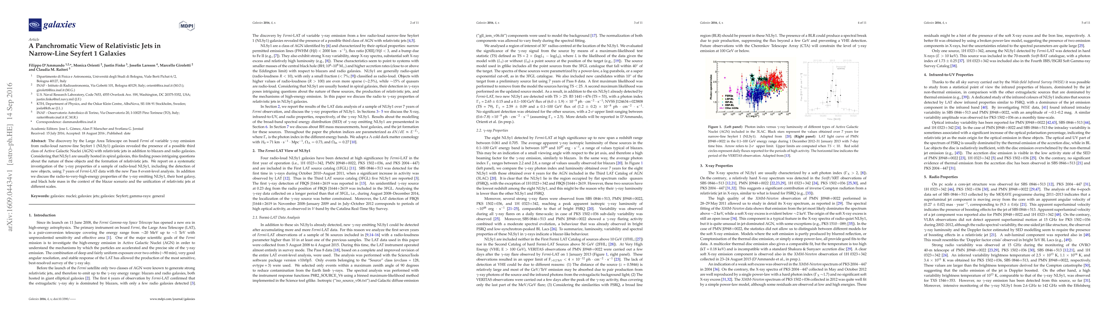 This paper investigates the gamma-ray emissions from radio-loud narrow-line Seyfert 1 (NLSy1) galaxies, revealing a potential third class of Active Galactic Nuclei with relativistic jets. Using 7 years of Fermi-LAT data, the study identifies new gamma-ray emitting NLSy1s and explores their radio-to-very-high-energy properties in relation to blazars and jet formation theories.