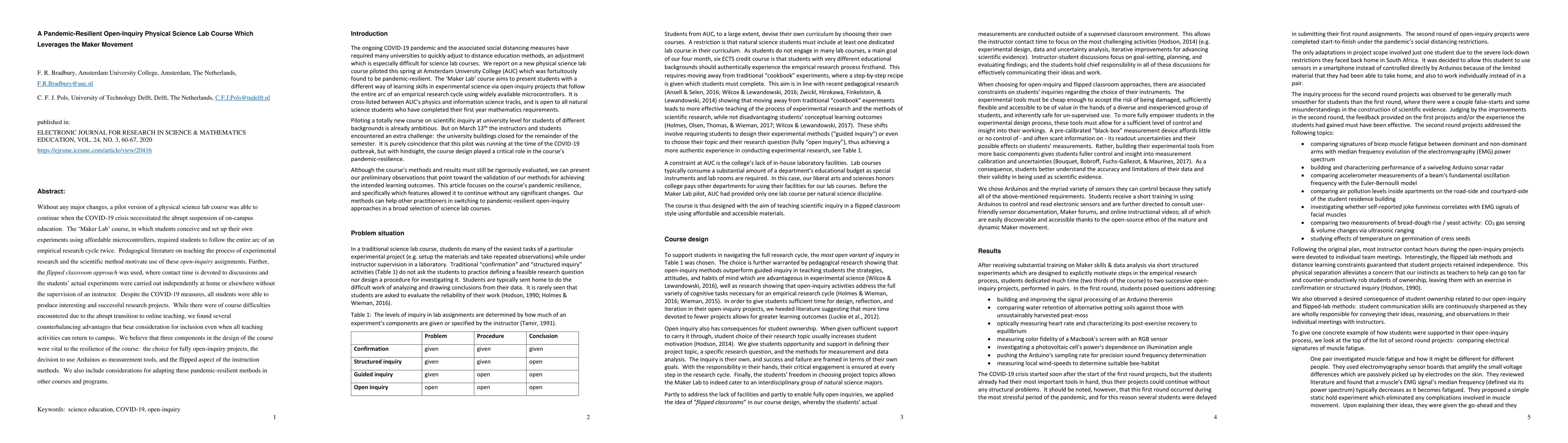 Without any major changes, a pilot version of a physical science lab course was able to continue when the COVID-19 crisis necessitated the abrupt suspension of on-campus education. The 'Maker Lab' course, in which students conceive and set up their own experiments using affordable microcontrollers, required students to follow the entire arc of an empirical research cycle twice. The decision for and facilitation of such open-inquiry projects was based on and warranted by the literature on teaching the process of experimental research and methods of scientific research. The flipped classroom approach was used, where contact time is devoted to discussions and the students' actual experiments were carried out independently at home or elsewhere without the in-person supervision of an instructor. Despite the COVID-19 measures, all students were able to produce interesting and successful research projects. While there were of course difficulties encountered due to the abrupt transition to online teaching, we found several counterbalancing advantages that bear consideration for inclusion even when all teaching activities can return to campus. We believe that three components in the design of the course were vital to the resilience of the course: the choice for fully open-inquiry projects, the decision to use Arduinos as measurement tools, and the flipped aspect of the instruction methods. We also include considerations for adapting these pandemic-resilient methods in other courses and programs.