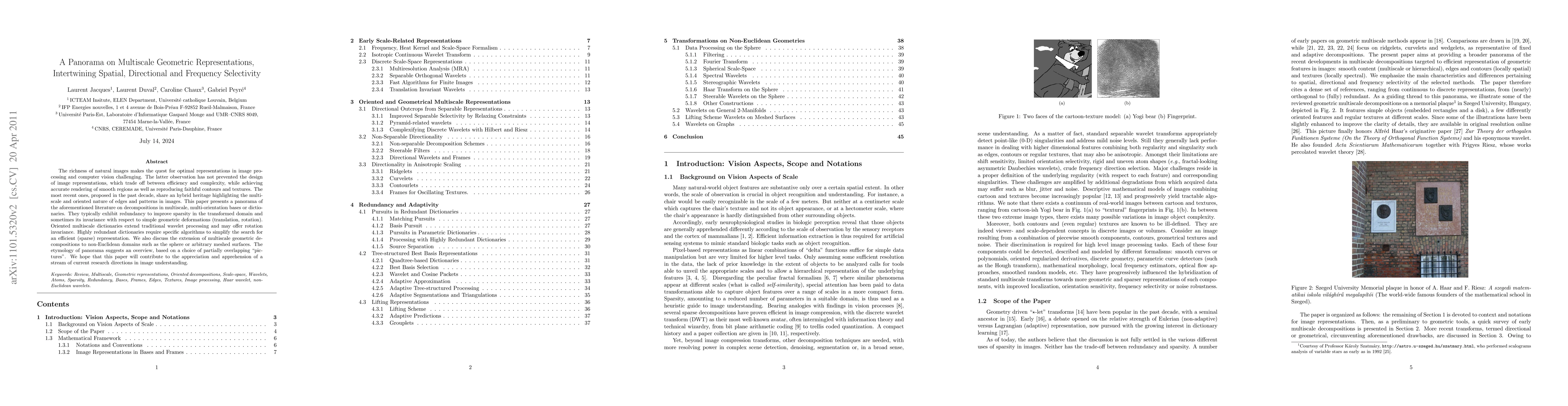 The richness of natural images makes the quest for optimal representations in image processing and computer vision challenging. The latter observation has not prevented the design of image representations, which trade off between efficiency and complexity, while achieving accurate rendering of smooth regions as well as reproducing faithful contours and textures. The most recent ones, proposed in the past decade, share an hybrid heritage highlighting the multiscale and oriented nature of edges and patterns in images. This paper presents a panorama of the aforementioned literature on decompositions in multiscale, multi-orientation bases or dictionaries. They typically exhibit redundancy to improve sparsity in the transformed domain and sometimes its invariance with respect to simple geometric deformations (translation, rotation). Oriented multiscale dictionaries extend traditional wavelet processing and may offer rotation invariance. Highly redundant dictionaries require specific algorithms to simplify the search for an efficient (sparse) representation. We also discuss the extension of multiscale geometric decompositions to non-Euclidean domains such as the sphere or arbitrary meshed surfaces. The etymology of panorama suggests an overview, based on a choice of partially overlapping "pictures". We hope that this paper will contribute to the appreciation and apprehension of a stream of current research directions in image understanding.
