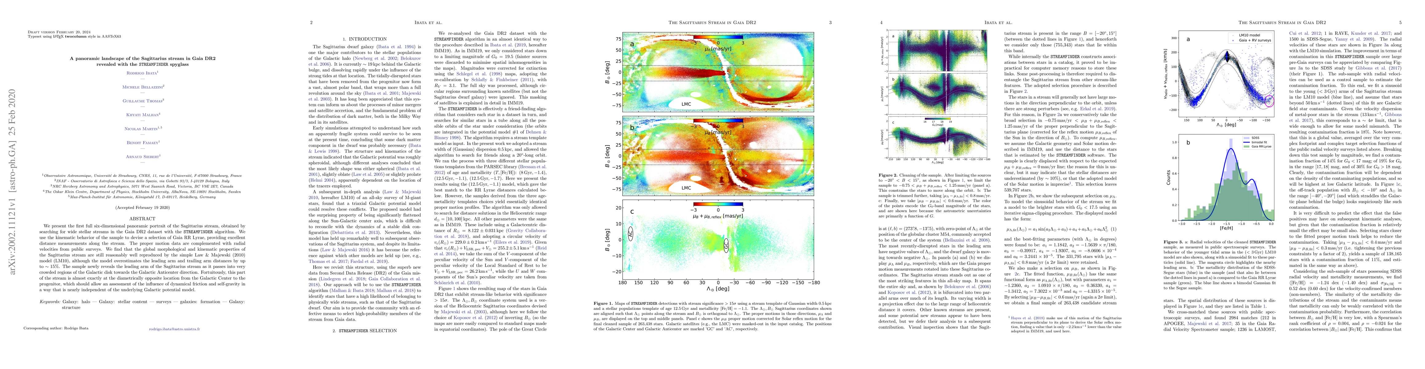 This paper presents a comprehensive six-dimensional view of the Sagittarius stream using Gaia DR2 data and the STREAMFINDER algorithm, revealing its leading arm in crowded regions. The findings show that the stream's properties are well-modeled by the LM10 model, though with some distance overestimation.
