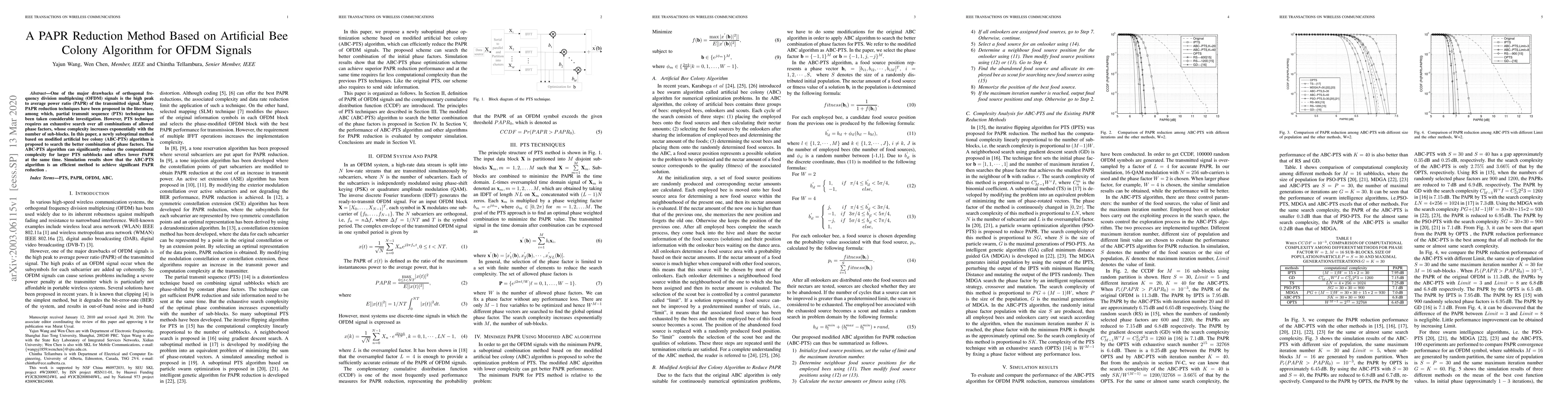 This paper proposes a modified artificial bee colony (ABC-PTS) algorithm to reduce the peak-to-average power ratio (PAPR) in OFDM signals, offering a more efficient alternative to the exhaustive search in the partial transmit sequence (PTS) technique. The ABC-PTS algorithm significantly lowers computational complexity and achieves lower PAPR compared to traditional methods.