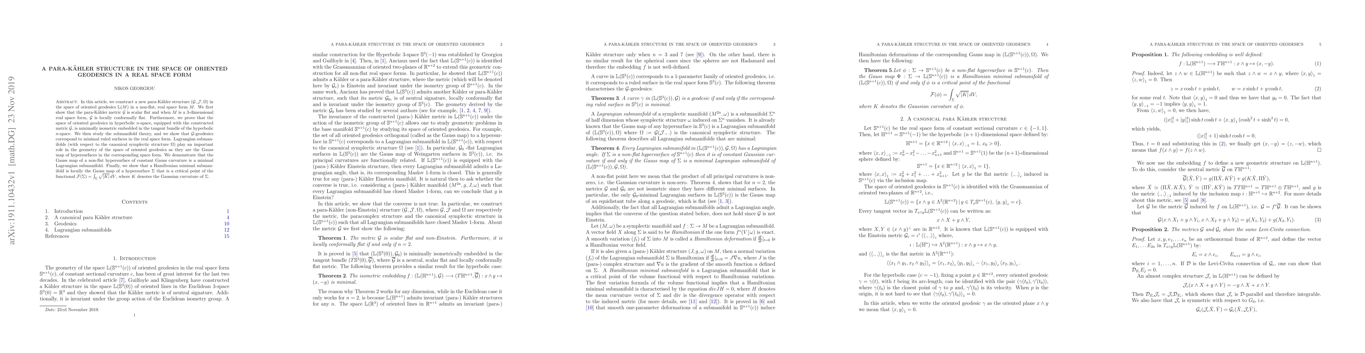 In this article, we construct a new para-K\"ahler structure $({\mathcal G},{\mathcal J},\Omega)$ in the space of oriented geodesics ${\mathbb L}(M)$ in a non-flat, real space form $M$. We first show that the para-K\"ahler metric ${\mathcal G}$ is scalar flat and when $M$ is a 3-dimensional real space form, ${\mathcal G}$ is locally conformally flat. Furthermore, we prove that the space of oriented geodesics in hyperbolic $n$-space, equipped with the constructed metric ${\mathcal G}$, is minimally isometric embedded in the tangent bundle of the hyperbolic $n$-space. We then study the submanifold theory, and we show that ${\mathcal G}$-geodesics correspond to minimal ruled surfaces in the real space form. Lagrangian submanifolds (with respect to the canonical symplectic structure $\Omega$) play an important role in the geometry of the space of oriented geodesics as they are the Gauss map of hypersurfaces in the corresponding space form. We demonstrate that the Gauss map of a non-flat hypersurface of constant Gauss curvature is a minimal Lagrangian submanifold. Finally, we show that a Hamiltonian minimal submanifold is locally the Gauss map of a hypersurface $\Sigma$ that is a critical point of the functional $\mathcal{F}(\Sigma)=\int_{\Sigma}\sqrt{|K|}\,dV$, where $K$ denotes the Gaussian curvature of $\Sigma$.