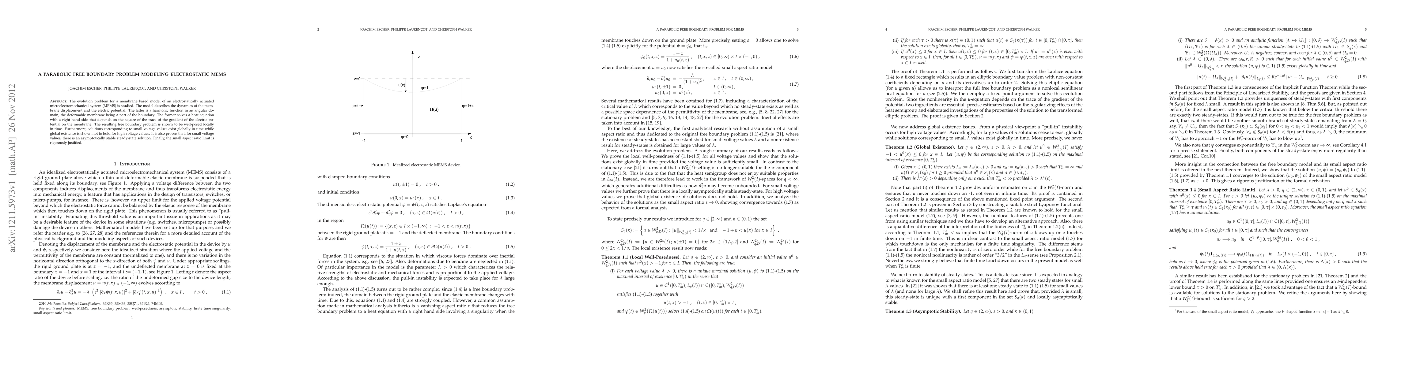 This paper studies a parabolic free boundary problem modeling electrostatic MEMS, demonstrating local and global existence of solutions for small and large voltages, respectively. It proves the existence of an asymptotically stable steady-state for small voltages and justifies the small aspect ratio limit.
