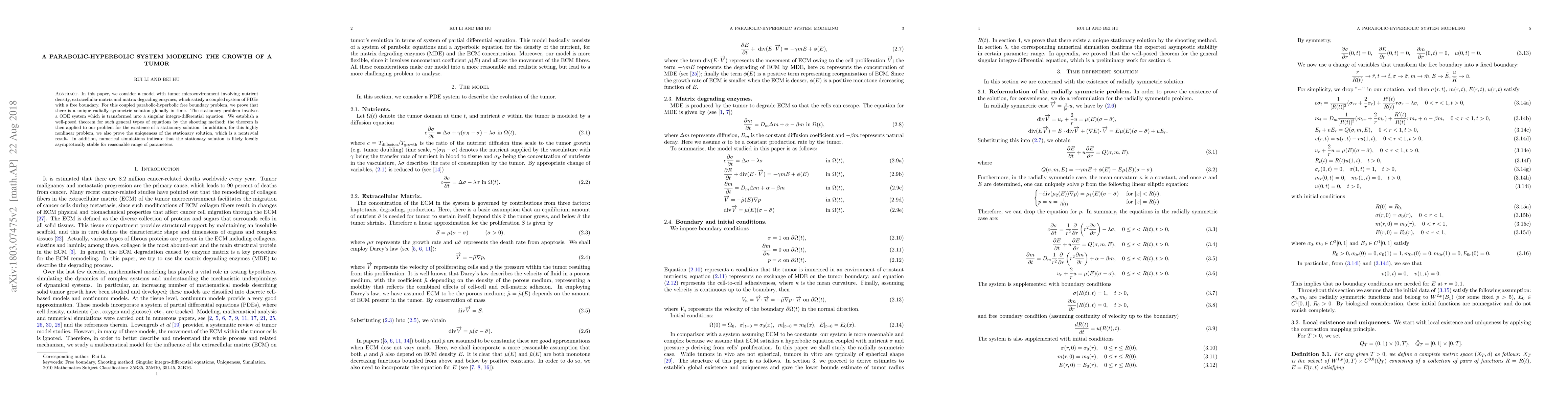 In this paper, we consider a model with tumor microenvironment involving nutrient density, extracellular matrix and matrix-degrading enzymes, which satisfy a coupled system of PDEs with a free boundary. For this coupled parabolic-hyperbolic free boundary problem, we prove that there is a unique radially symmetric solution globally in time. The stationary problem involves an ODE system which is transformed into a singular integro-differential equation. We establish a well-posed theorem for such general types of equations by the shooting method; the theorem is then applied to our problem for the existence of a stationary solution. In addition, for this highly nonlinear problem, we also prove the uniqueness of the stationary solution, which is a nontrivial result. In addition, numerical simulations indicate that the stationary solution is likely locally asymptotically stable for reasonable range of parameters.