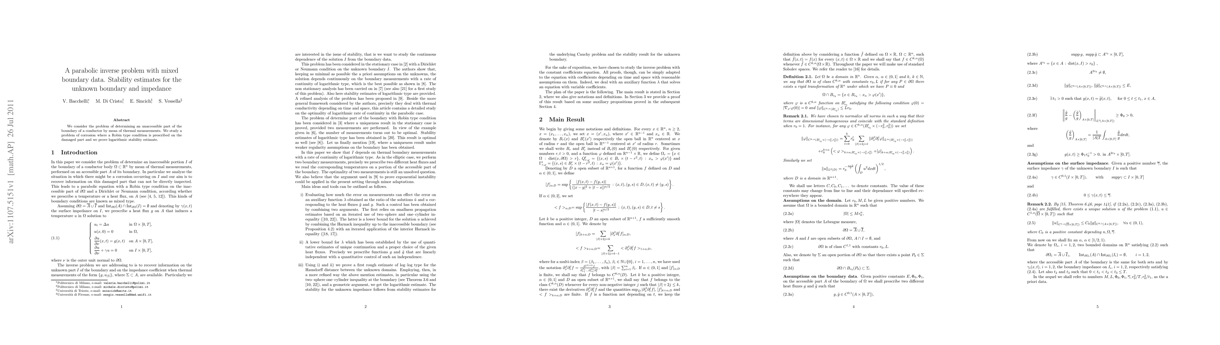 This paper addresses an inverse problem for a parabolic equation involving inaccessible boundary parts of a conductor, determined via thermal measurements. It establishes logarithmic stability estimates for identifying the unknown boundary and impedance under a Robin boundary condition due to corrosion.