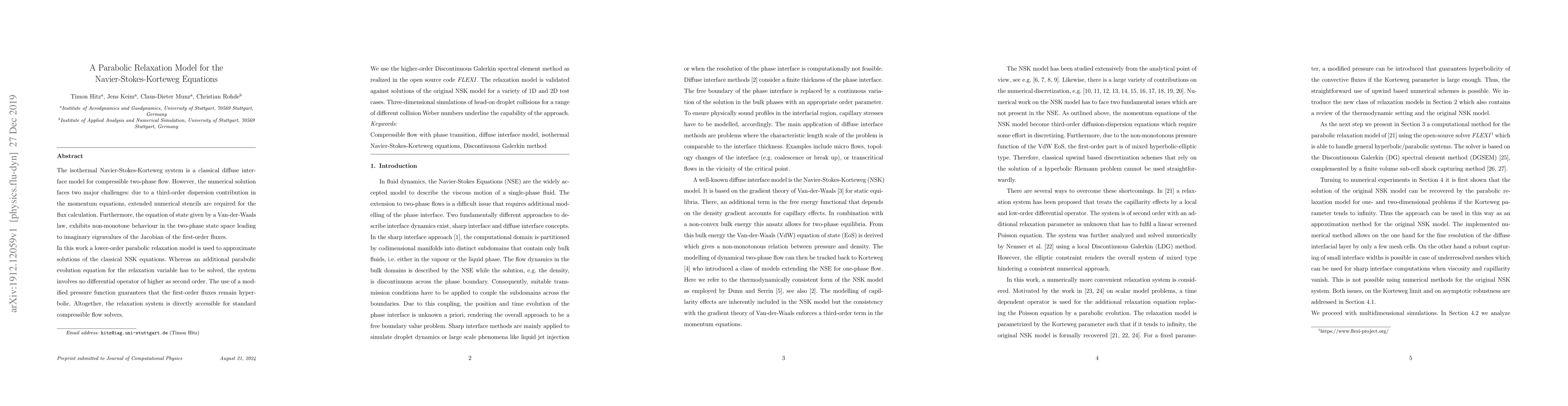 The isothermal Navier-Stokes-Korteweg system is a classical diffuse interface model for compressible two-phase flow. However, the numerical solution faces two major challenges: due to a third-order dispersion contribution in the momentum equations, extended numerical stencils are required for the flux calculation. Furthermore, the equation of state given by a Van-der-Waals law, exhibits non-monotone behaviour in the two-phase state space leading to imaginary eigenvalues of the Jacobian of the first-order fluxes. In this work a lower-order parabolic relaxation model is used to approximate solutions of the classical NSK equations. Whereas an additional parabolic evolution equation for the relaxation variable has to be solved, the system involves no differential operator of higher as second order. The use of a modified pressure function guarantees that the first-order fluxes remain hyperbolic. Altogether, the relaxation system is directly accessible for standard compressible flow solvers. We use the higher-order Discontinuous Galerkin spectral element method as realized in the open source code FLEXI. The relaxation model is validated against solutions of the original NSK model for a variety of 1D and 2D test cases. Three-dimensional simulations of head-on droplet collisions for a range of different collision Weber numbers underline the capability of the approach.