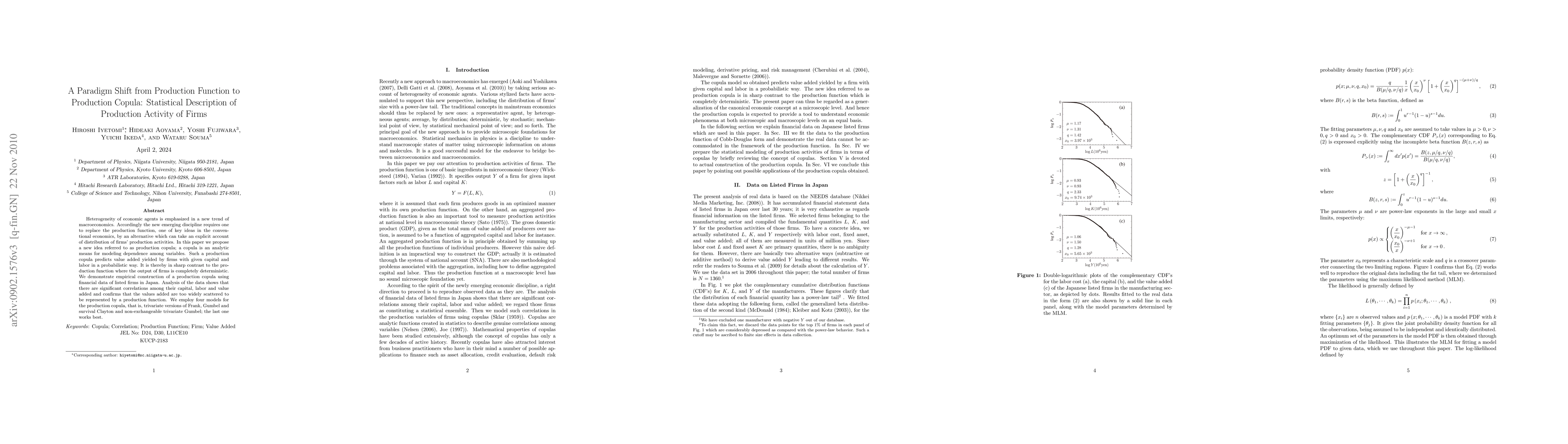 Heterogeneity of economic agents is emphasized in a new trend of macroeconomics. Accordingly the new emerging discipline requires one to replace the production function, one of key ideas in the conventional economics, by an alternative which can take an explicit account of distribution of firms' production activities. In this paper we propose a new idea referred to as production copula; a copula is an analytic means for modeling dependence among variables. Such a production copula predicts value added yielded by firms with given capital and labor in a probabilistic way. It is thereby in sharp contrast to the production function where the output of firms is completely deterministic. We demonstrate empirical construction of a production copula using financial data of listed firms in Japan. Analysis of the data shows that there are significant correlations among their capital, labor and value added and confirms that the values added are too widely scattered to be represented by a production function. We employ four models for the production copula, that is, trivariate versions of Frank, Gumbel and survival Clayton and non-exchangeable trivariate Gumbel; the last one works best.