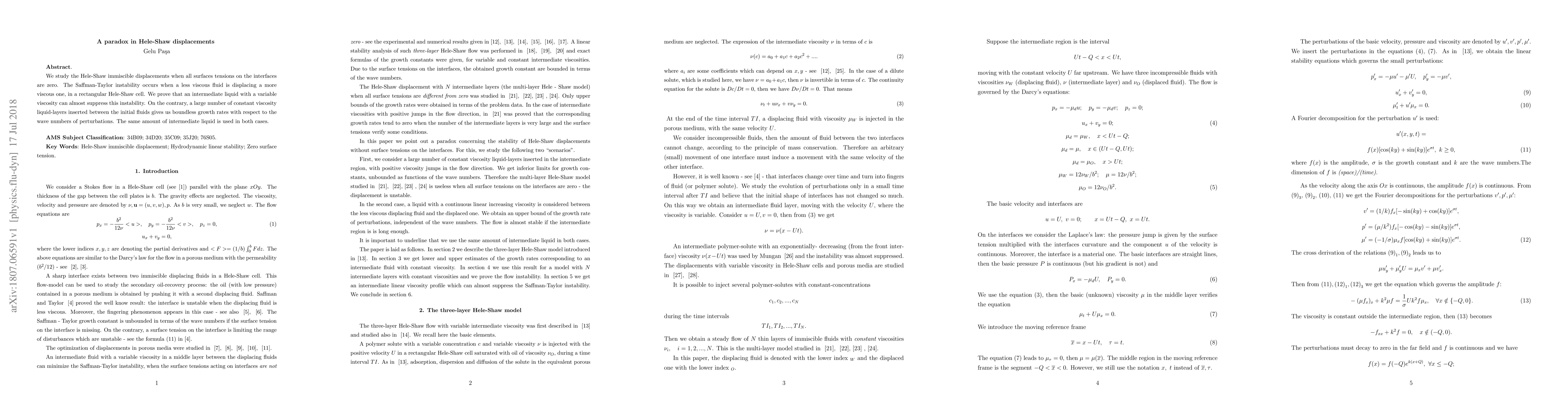 This paper investigates Hele-Shaw displacements where all surface tensions are zero, revealing that an intermediate liquid with variable viscosity can nearly suppress Saffman-Taylor instability, while multiple constant viscosity layers lead to unbounded growth rates of perturbations despite using the same amount of intermediate liquid.