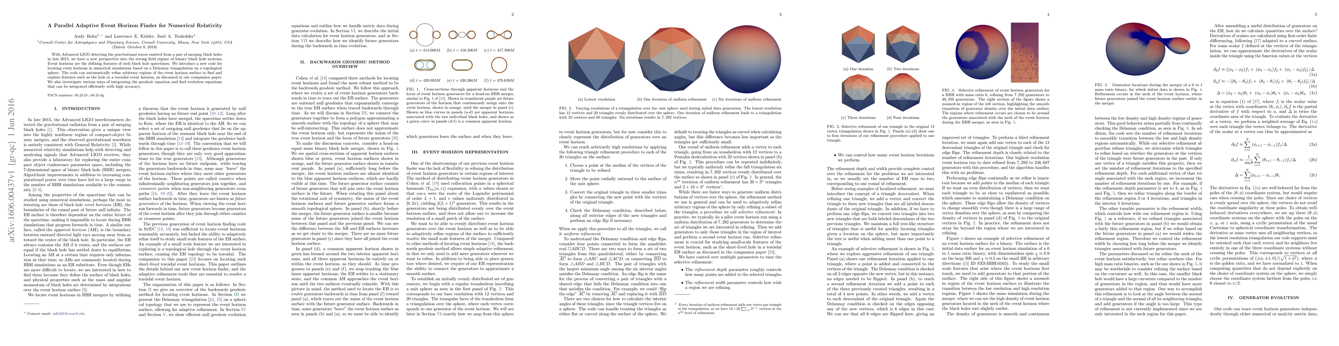 This paper presents a novel method using Delaunay triangulation to locate event horizons in numerical simulations of merging black holes, enabling automatic refinement of horizon features. It also explores efficient integration techniques for geodesic equations in such simulations.