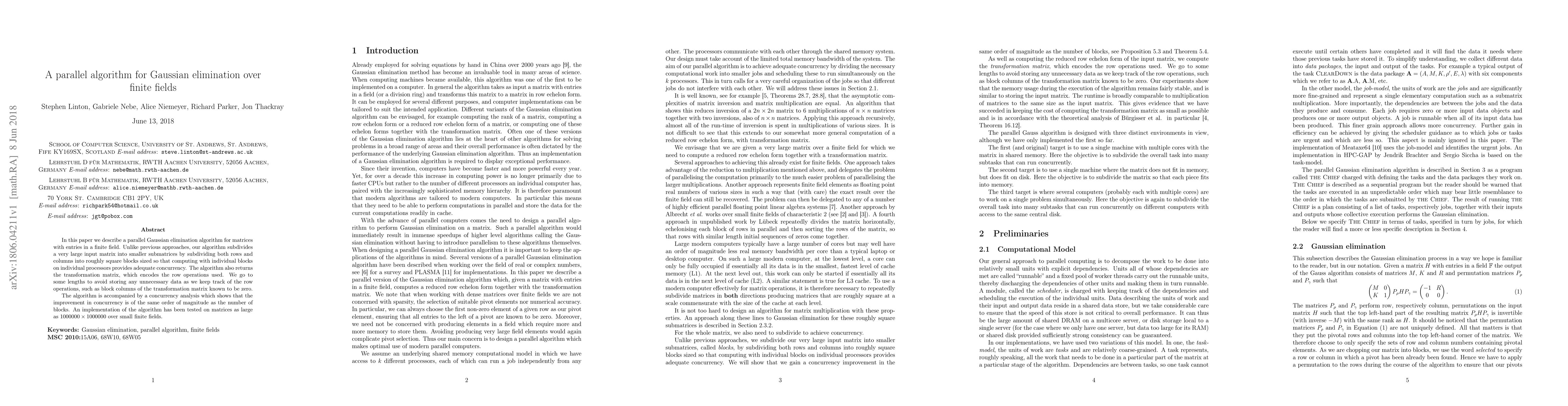 This paper presents a parallel Gaussian elimination algorithm for matrices over finite fields, subdividing large matrices into smaller blocks to enhance concurrency across processors. The algorithm efficiently tracks row operations and avoids unnecessary data storage, achieving significant concurrency improvements.
