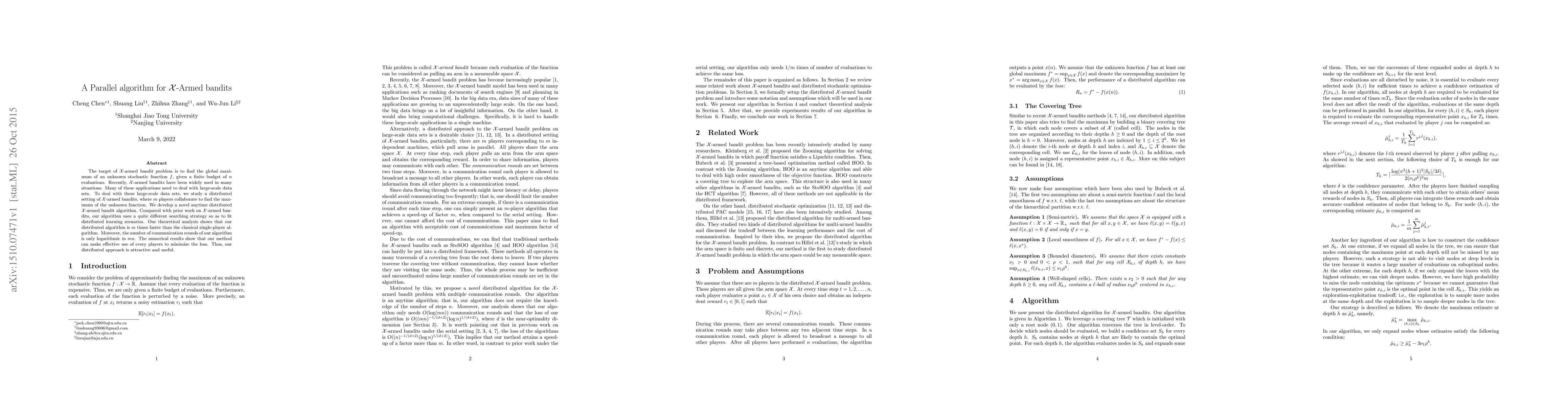 The target of $\mathcal{X}$-armed bandit problem is to find the global maximum of an unknown stochastic function $f$, given a finite budget of $n$ evaluations. Recently, $\mathcal{X}$-armed bandits have been widely used in many situations. Many of these applications need to deal with large-scale data sets. To deal with these large-scale data sets, we study a distributed setting of $\mathcal{X}$-armed bandits, where $m$ players collaborate to find the maximum of the unknown function. We develop a novel anytime distributed $\mathcal{X}$-armed bandit algorithm. Compared with prior work on $\mathcal{X}$-armed bandits, our algorithm uses a quite different searching strategy so as to fit distributed learning scenarios. Our theoretical analysis shows that our distributed algorithm is $m$ times faster than the classical single-player algorithm. Moreover, the number of communication rounds of our algorithm is only logarithmic in $mn$. The numerical results show that our method can make effective use of every players to minimize the loss. Thus, our distributed approach is attractive and useful.