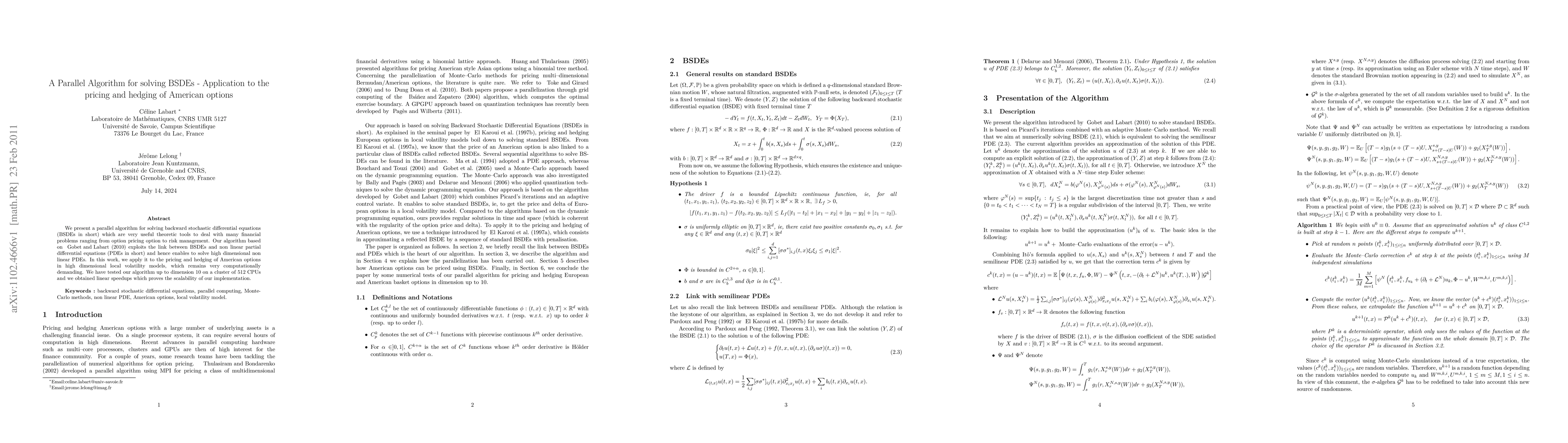 This paper introduces a parallel algorithm for solving backward stochastic differential equations (BSDEs), leveraging their connection to nonlinear partial differential equations (PDEs). The algorithm is applied to the computationally demanding pricing and hedging of American options in high-dimensional local volatility models, demonstrating scalability and linear speedups on a cluster of 512 CPUs.