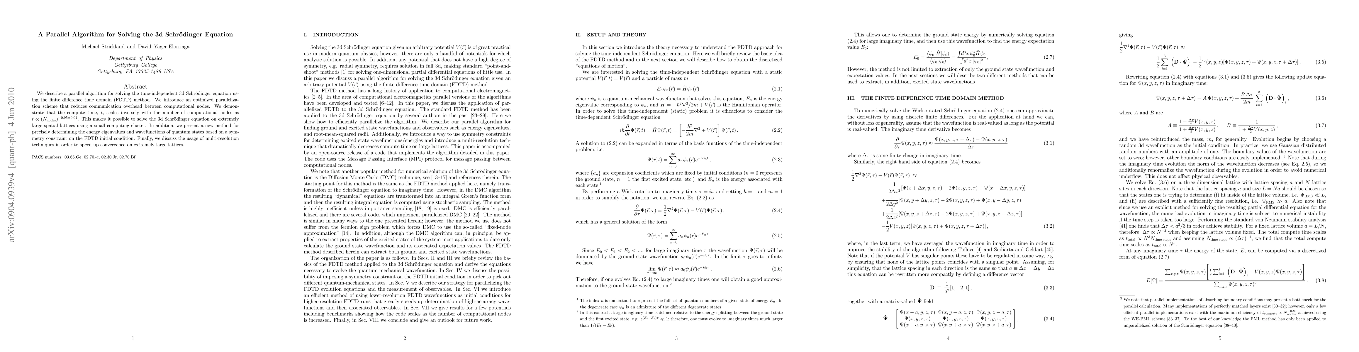 This paper presents a parallel algorithm for solving the 3D time-independent Schrödinger equation using the FDTD method, optimizing parallelization to reduce communication overhead. The algorithm scales compute time inversely with the number of nodes, enabling large-scale solutions on small clusters.