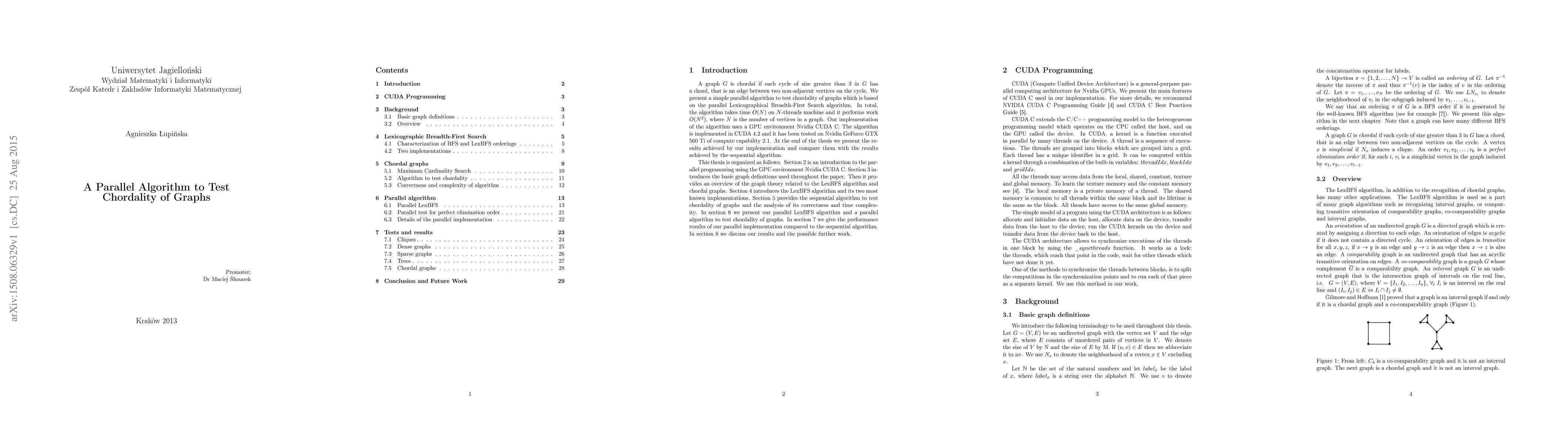 We present a simple parallel algorithm to test chordality of graphs which is based on the parallel Lexicographical Breadth-First Search algorithm. In total, the algorithm takes time O(N ) on N-threads machine and it performs work O(N 2 ) , where N is the number of vertices in a graph. Our implementation of the algorithm uses a GPU environment Nvidia CUDA C. The algorithm is implemented in CUDA 4.2 and it has been tested on Nvidia GeForce GTX 560 Ti of compute capability 2.1. At the end of the thesis we present the results achieved by our implementation and compare them with the results achieved by the sequential algorithm