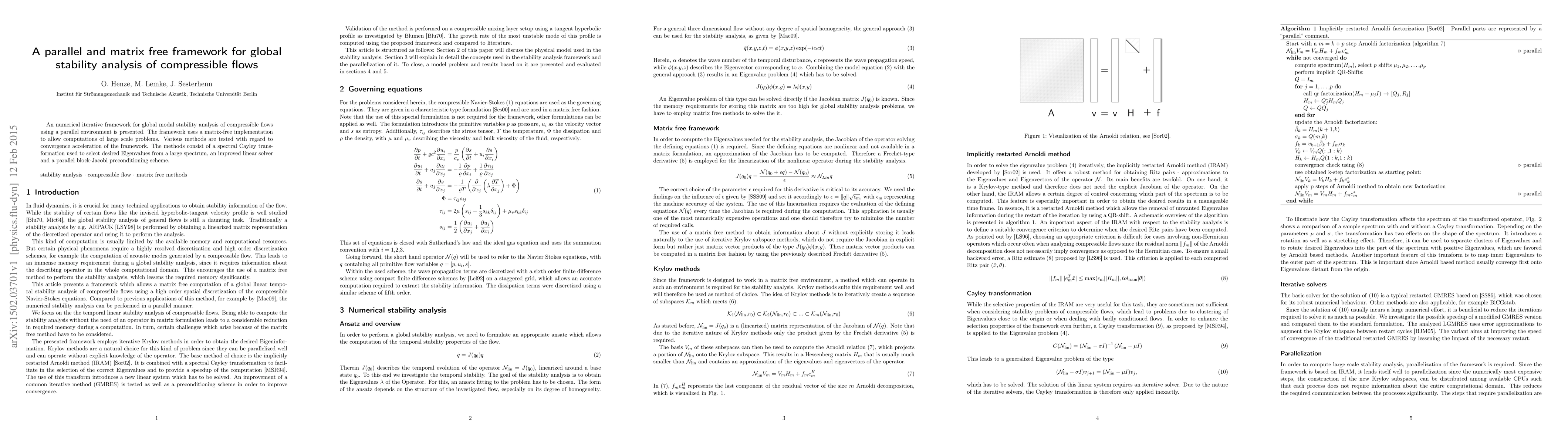 This paper introduces a parallel, matrix-free framework for global modal stability analysis of compressible flows, employing spectral Cayley transformation, an improved linear solver, and parallel block-Jacobi preconditioning for convergence acceleration. The framework is designed for large-scale computational problems.