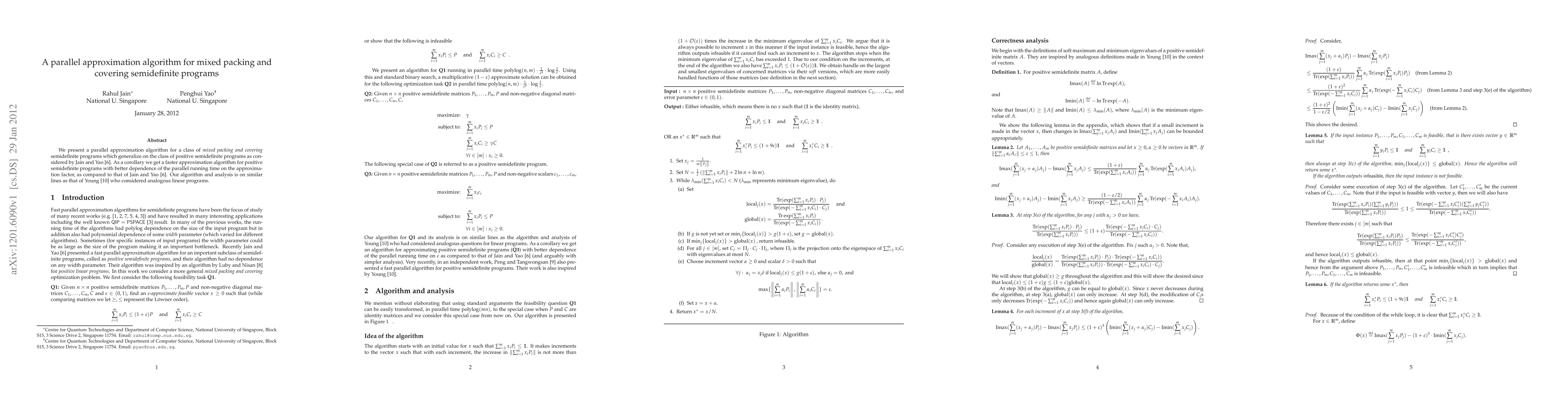 The paper introduces a parallel approximation algorithm for mixed packing and covering semidefinite programs, extending the work of Jain and Yao, and offering improved runtime efficiency relative to previous methods. This algorithm parallels Young's approach for linear programs, achieving better parallel running time dependence on the approximation factor.